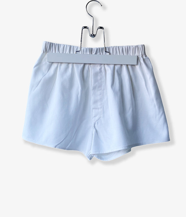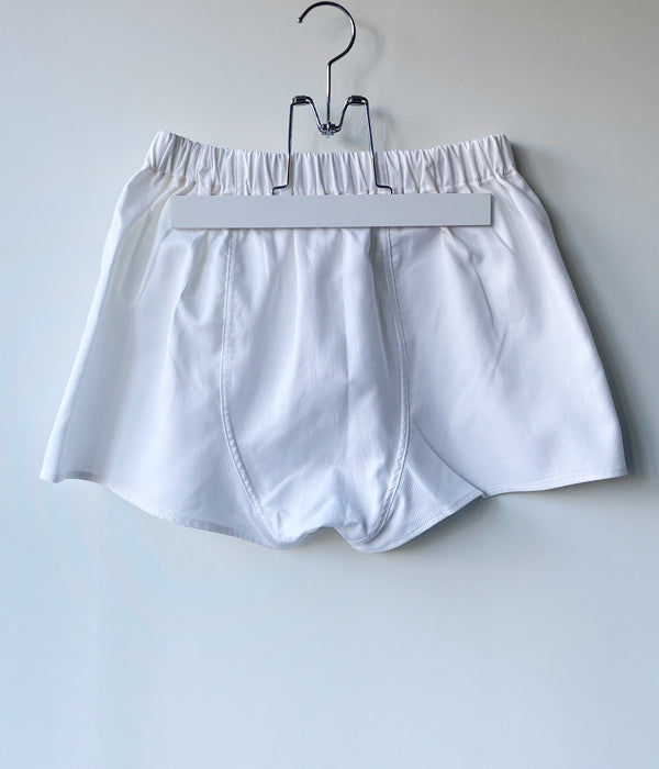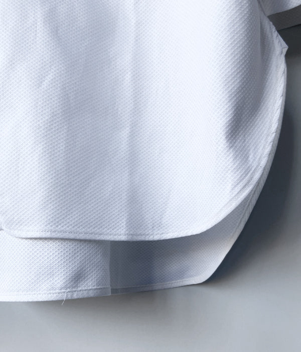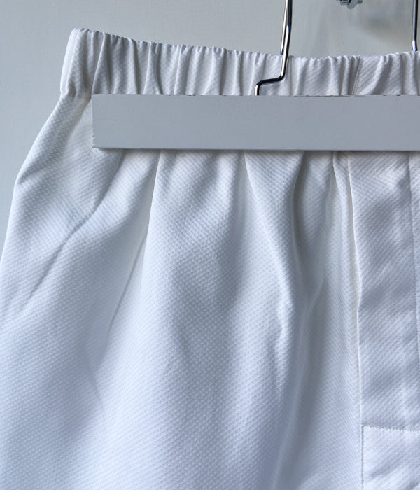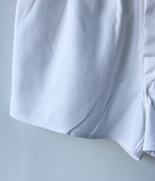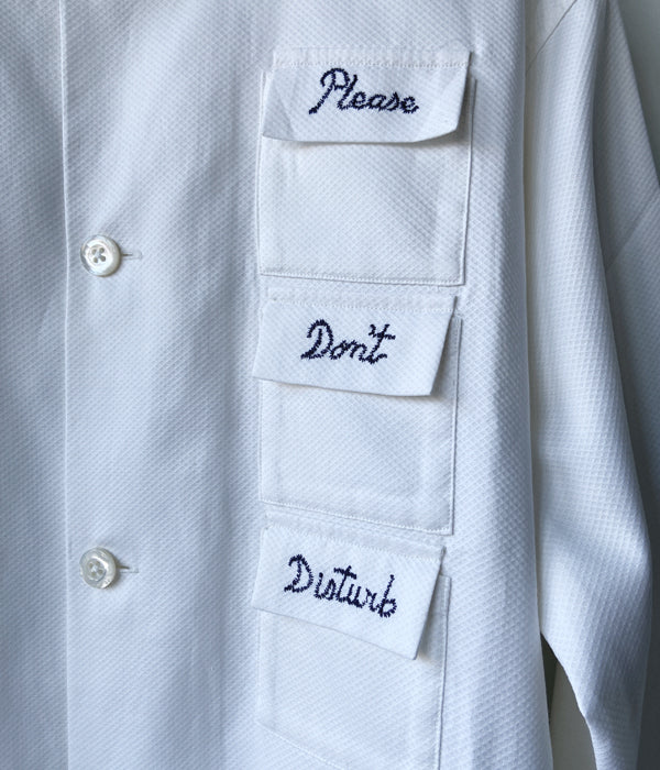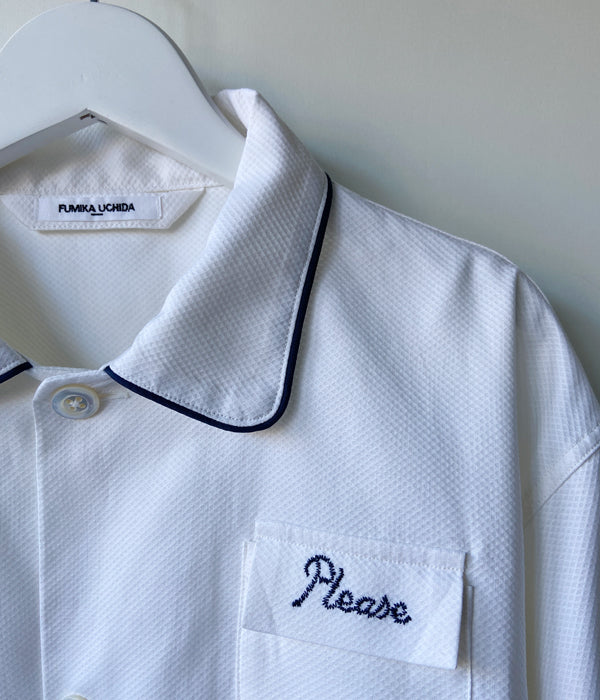 FUMIKA_UCHIDAからPAJAMA SETが入荷しました。21秋展のシャツのビブス部分用に作成したシルクコットンのアートピケ生地を使って作るロングシャツとトランクスのセットアップパジャマ。シャツは襟周りと袖口カフスにシルクのコードパイピングを刺繍のステッチの色と合わせて作成。フロント5つボタン開き。左胸位置に刺繍入りのフラップ付き。パッチポケットが縦に3つ繋がって付いています。トランクスはゴム入りのエラスティックなウエスト。革靴と合わせてアンバランスさを楽しむのも〇
