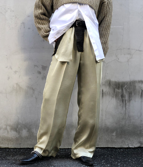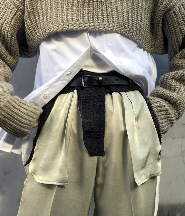 FUMIKA_UCHIDAからPlaid Nep Tweed Satin/CUT-OUT SLACKSが入荷しました。カラーネップが入ったシェットランド糸を柔らかく縮絨したプレイドツイード生地とブロークンサテンで作成のスラックス。一度作ったものを壊す2段階工程を経て、表地のツイード生地を断ち切り、裏地、前立て、袋布などパンツを構成するウエスト周りのディテールが顕わになっているデザイン。ノータックの太めストレートシルエットでサテンの落ち感と長めのレングスで裾をたゆませルーズに履く。トップスはシンプルに、足元はカジュアルに崩すのがお勧めです。