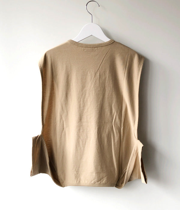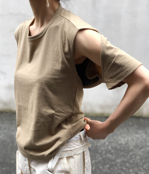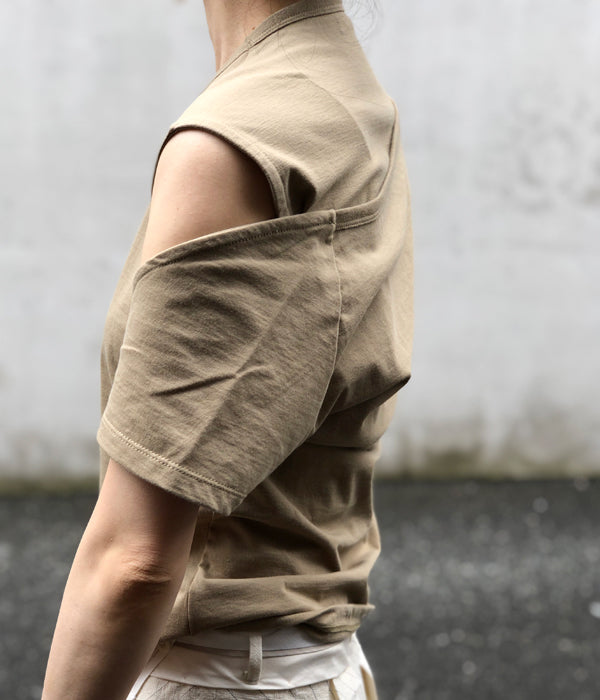 FUMIKA_UCHIDAからSEPARATE CHIBI SHORT-SLEEVE T-SHIRTSが入荷しました。継続のセパレートスリーブのディテールをコンパクトなサイズで作成したショートスリーブTシャツ。洗い込んでも毛羽立ちが少なく風合いが損なわれない特性を持つオーガニックコットンのオリジナル生地を使用。ジャストショルダーの肩からややタイトな身頃でヒップ上丈で、後身に付いた袖を自由な位置で止めて拘束感を出して着るデザインとなります。