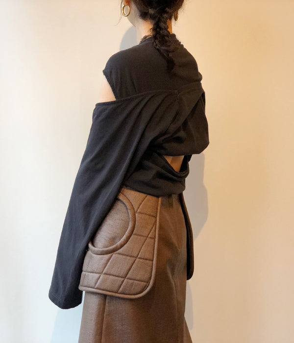 FUMIKA_UCHIDAからSEPARATE LONG-SLEEVE TEEが入荷しました。二層構造の後身により、ノースリーブ・ロングスリーブの着方が可能なカットソー。20AWのリピート型をドライタッチでムラのある表情を持つ生地に変更して作製。退色した黒とボルドー、洗濯で染まってしまったような白と味わい深いカラーもポイント。程よくリラックス感のあるシルエットながらステッチの色や部分ごとに変えた縫製仕様で、シンプルなボトムスに合わせても簡単に見せない存在感を放つ一枚です。