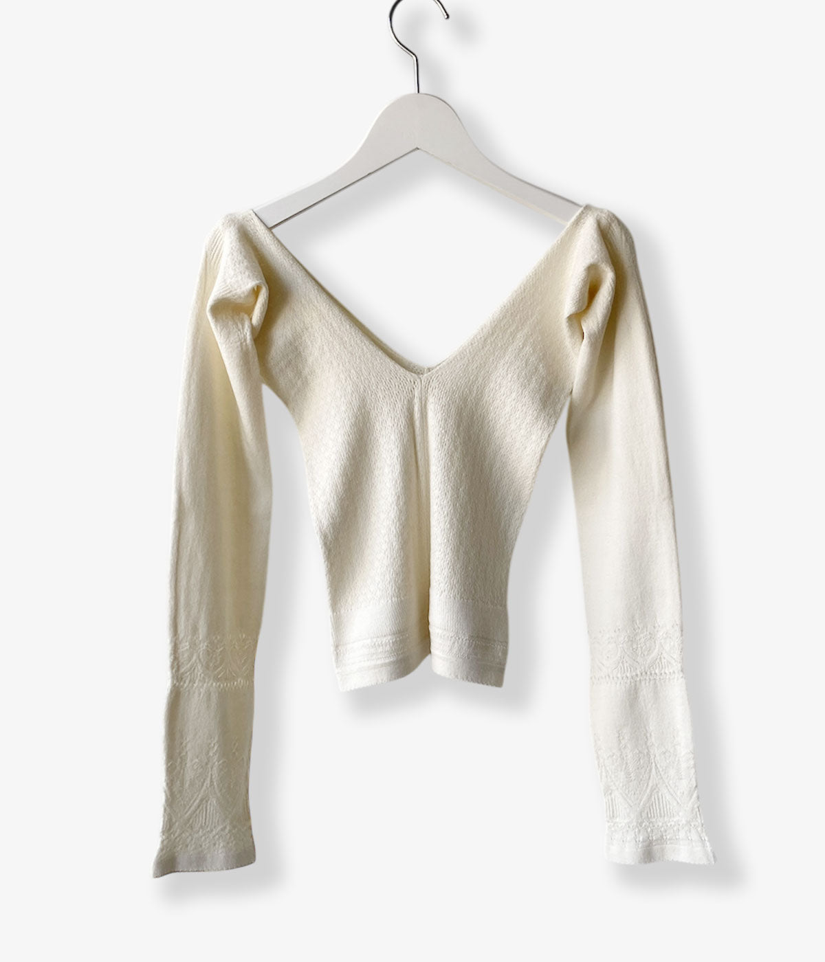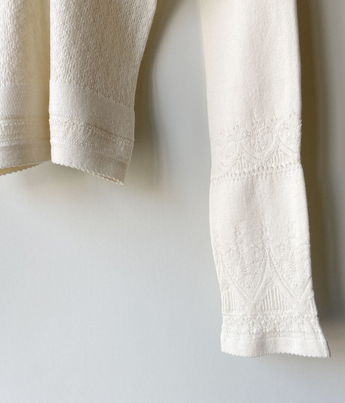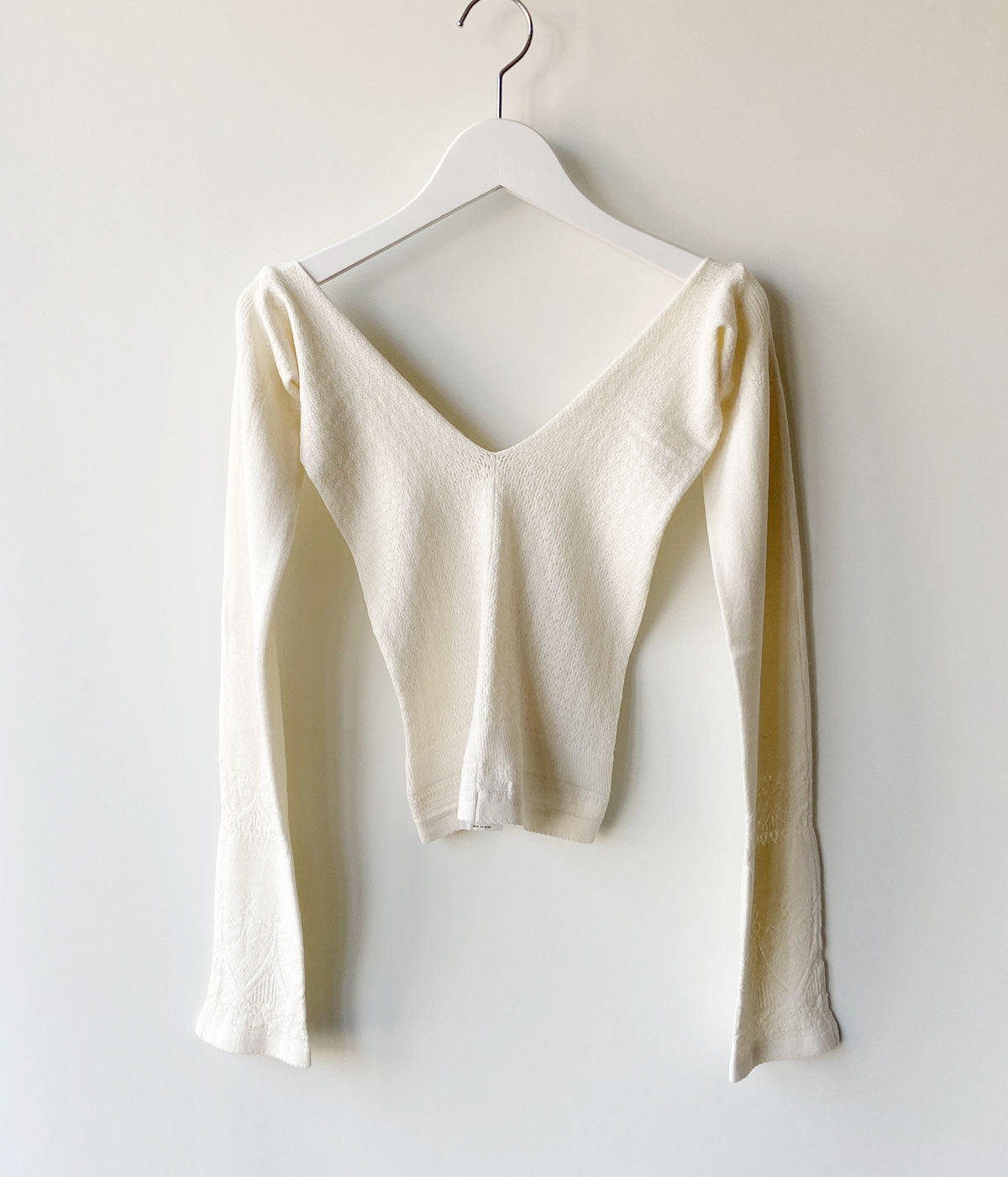 FUMIKA_UCHIDAからSILK LACE KNITTING TIGHTS TOPが入荷しました。シルクの自然な光沢とカシミアの柔らかさが特徴のストレッチ糸で作るタイツ型のオフショルダートップ。ヴィクトリアンレースグローブから着想を得た透かし編みをストレッチ糸を使用してアクティブな印象を取り入れたデザイン。
