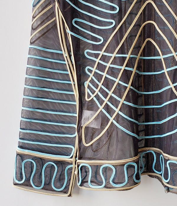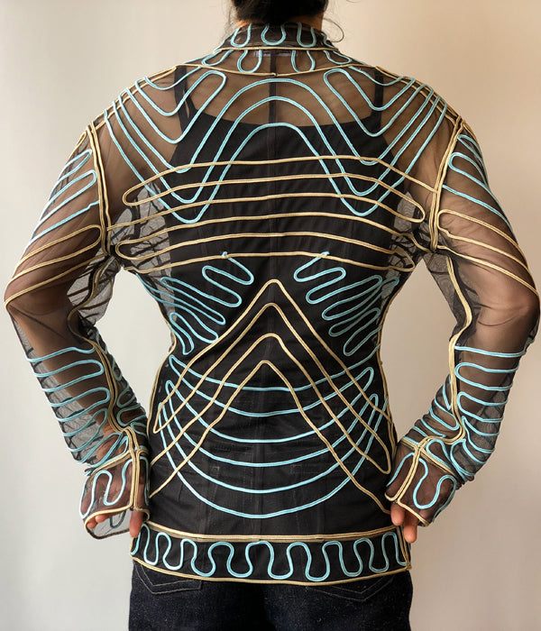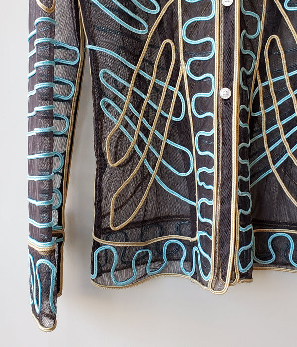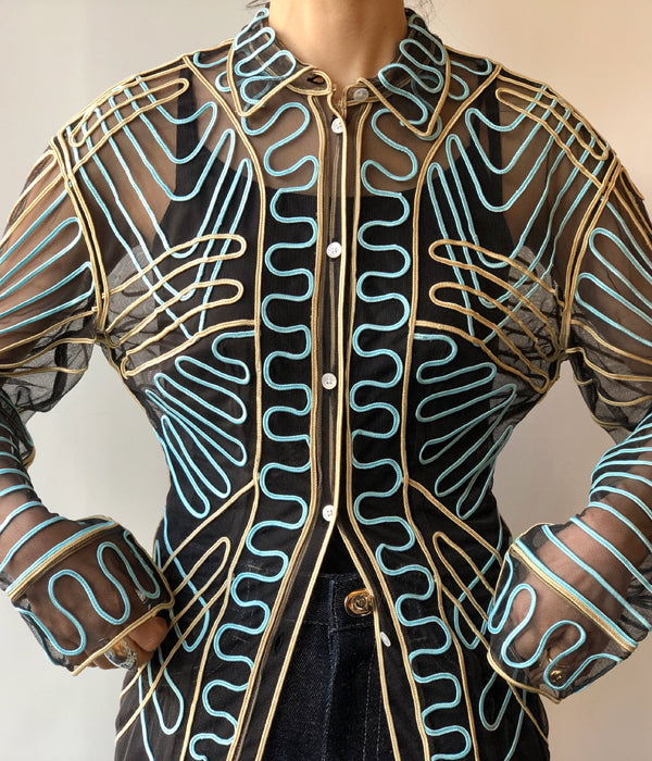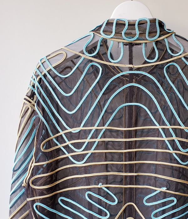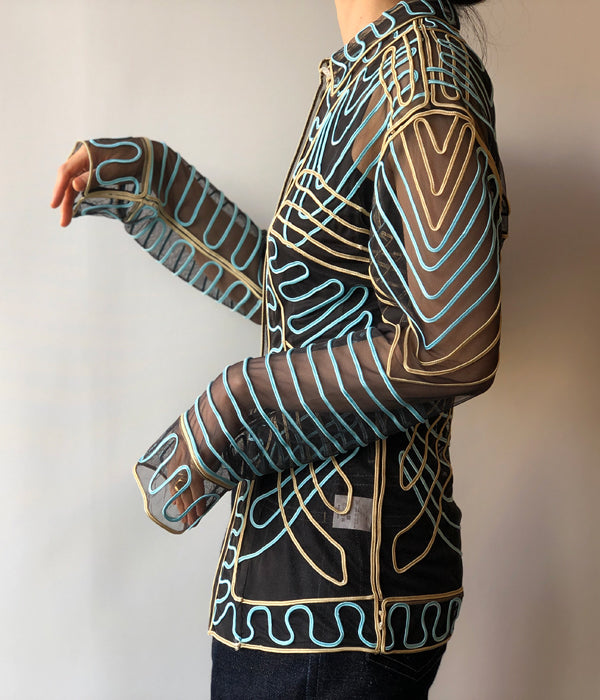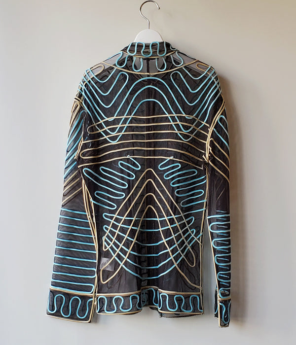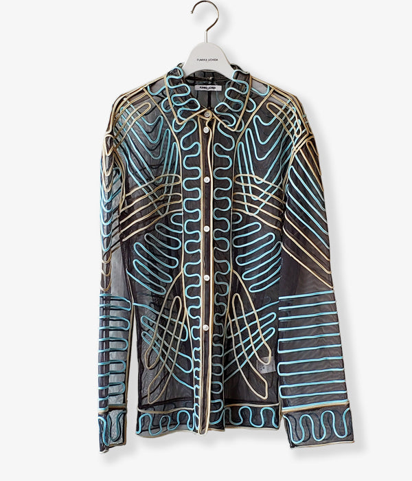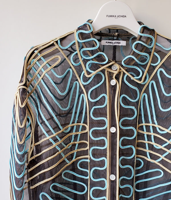 FUMIKA_UCHIDAからSOUTACHE BLOUSEが入荷しました。柔らかく肌当たりの良いチュールをベースに体のラインを強調するような幾何学的な柄のコード刺繍が特徴的なブラウス。ひと続きに刺繍を入れるため機械刺繍と手刺繍を組合せる、高度な技術が用いられています。オーバーショルダーから極端に絞られたウエストが特徴的で、一番下のボタン以外を留めて着ることで立体感のあるシルエットに。ネオンサインのような刺繍の柄を生かしたコーディネートを楽しみたい一枚です。