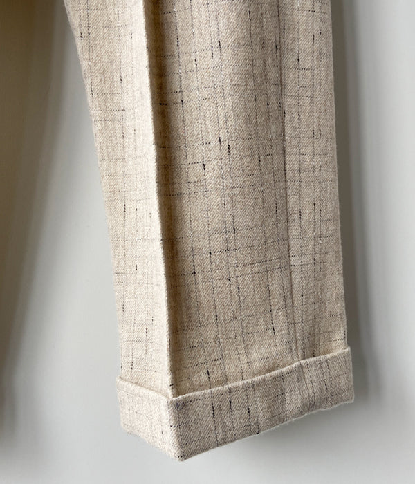 FUMIKA_UCHIDAからSPLASHED PATTERN WIDE TAPERED PANTSが入荷しました。シェットランド糸とノット糸をランダムなチェック柄に織った生地で作るノーウエストバンドデザインの2タックスラックス。ベースのトップ糸はイギリスのシェットランド糸で日本にはない微配色がミックスされた糸を選んで使用。生地で膨らみを出し柔らかく毛羽感のある風合いに仕上がっています。深い股上でセンタープレス入り。ゆとりあるヒップから裾にかけてテーパードシルエット。ブルゾンとセットアップでの着用もおすすめです。