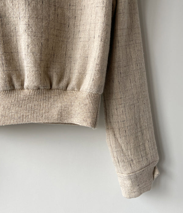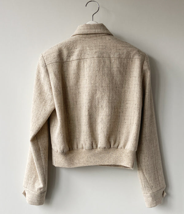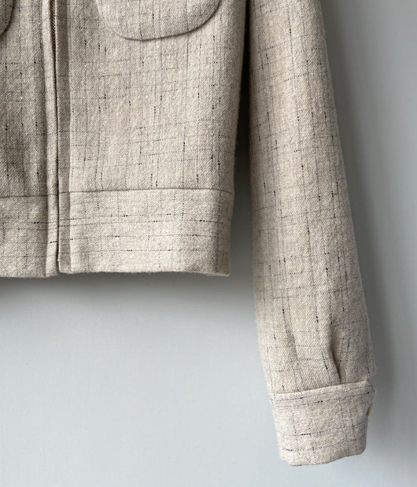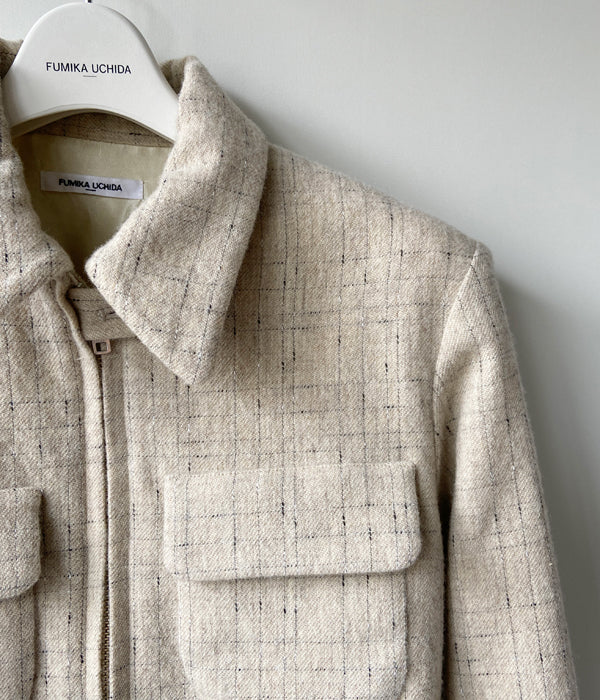 FUMIKA_UCHIDAからSPLASHED PATTERN ZIP-UP BLOUSONが入荷しました。シェットランド糸とノット糸をランダムなチェック柄に織った生地で作るジップアップブルゾン。ベースのトップ糸はイギリスのシェットランド糸で日本にはない微配色がミックスされた糸を選んで使用。生地で膨らみを出し柔らかく毛羽感のある風合いに仕上がっています。裏地はオリジナルのレーヨンアセテートサテンジャガード生地を使用。コンパクトなサイズ感が気分です。