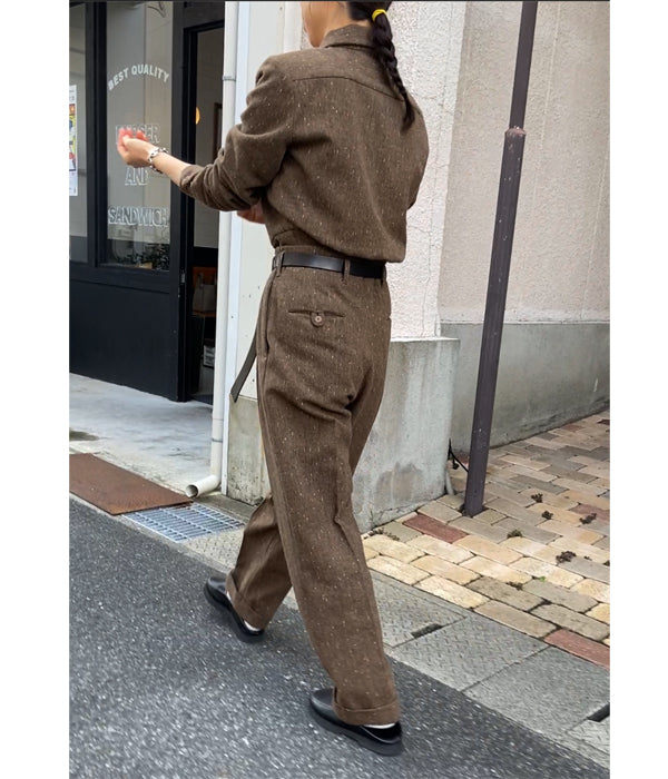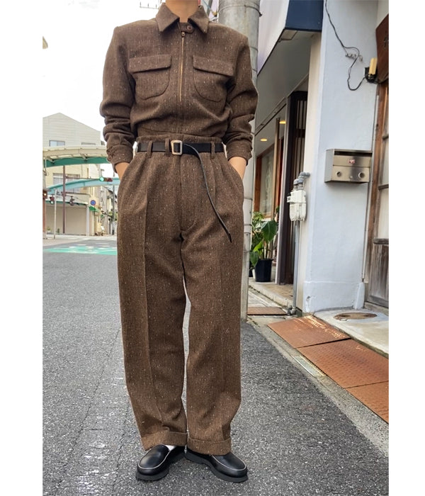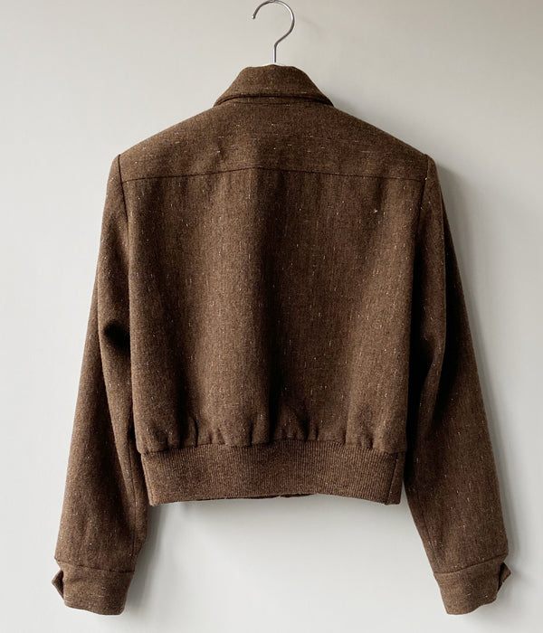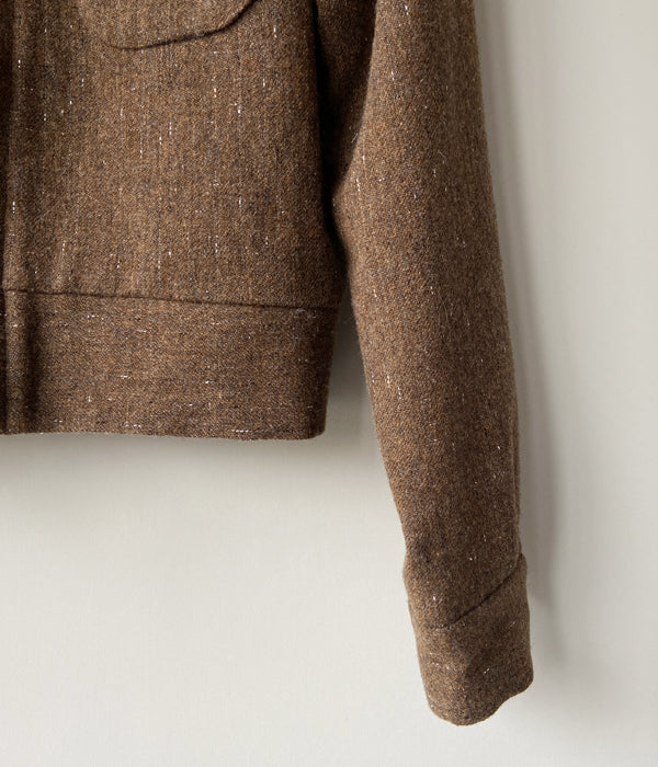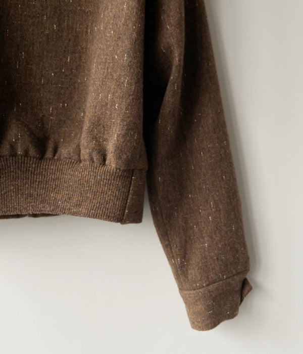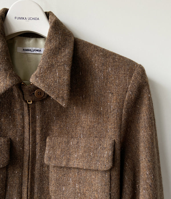 FUMIKA_UCHIDAからSPLASHED PATTERN ZIP-UP BLOUSONが入荷しました。シェットランド糸とノット糸をランダムなチェック柄に織った生地で作るジップアップブルゾン。ベースのトップ糸はイギリスのシェットランド糸で日本にはない微配色がミックスされた糸を選んで使用。生地で膨らみを出し柔らかく毛羽感のある風合いに仕上がっています。裏地はオリジナルのレーヨンアセテートサテンジャガード生地を使用。コンパクトなサイズ感が気分です。
