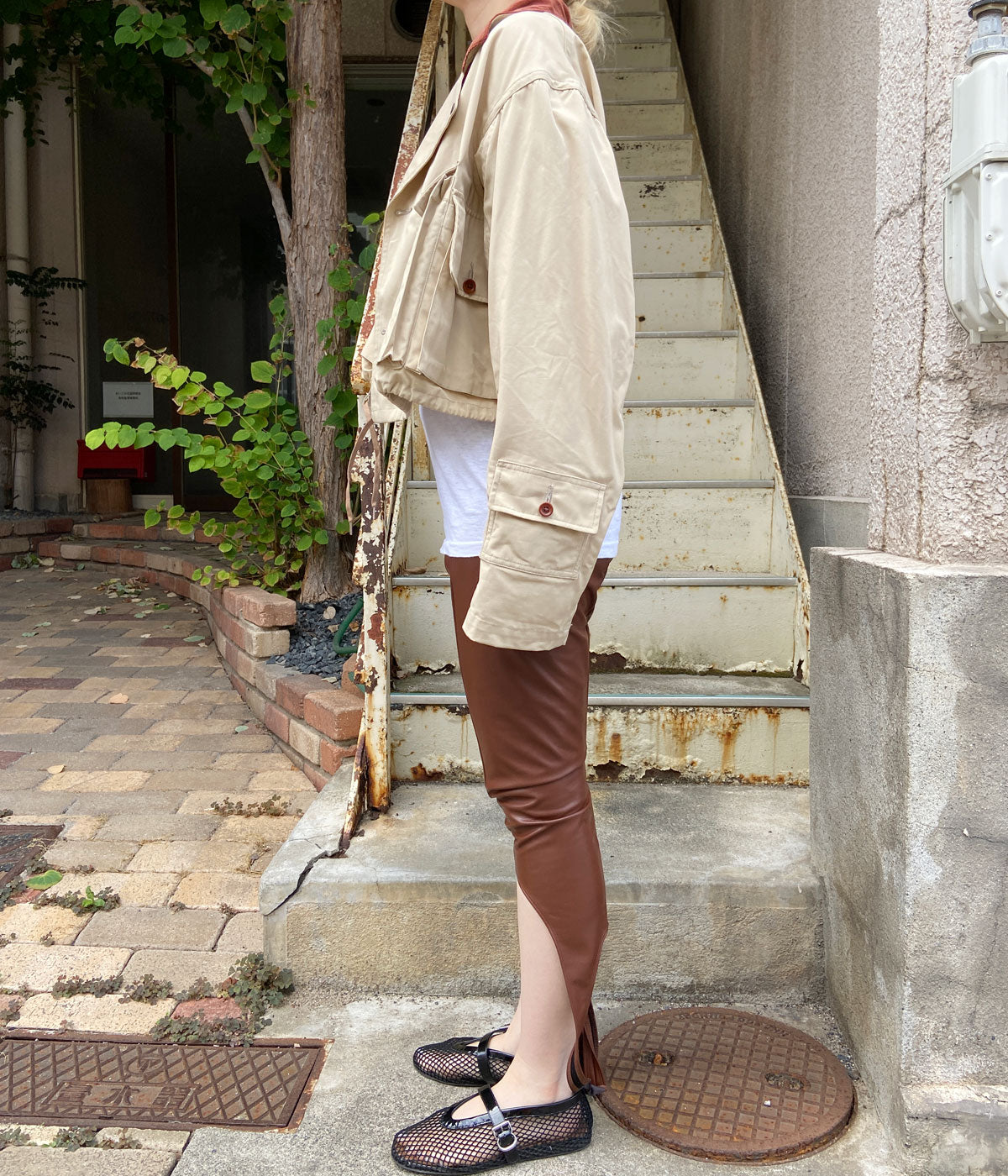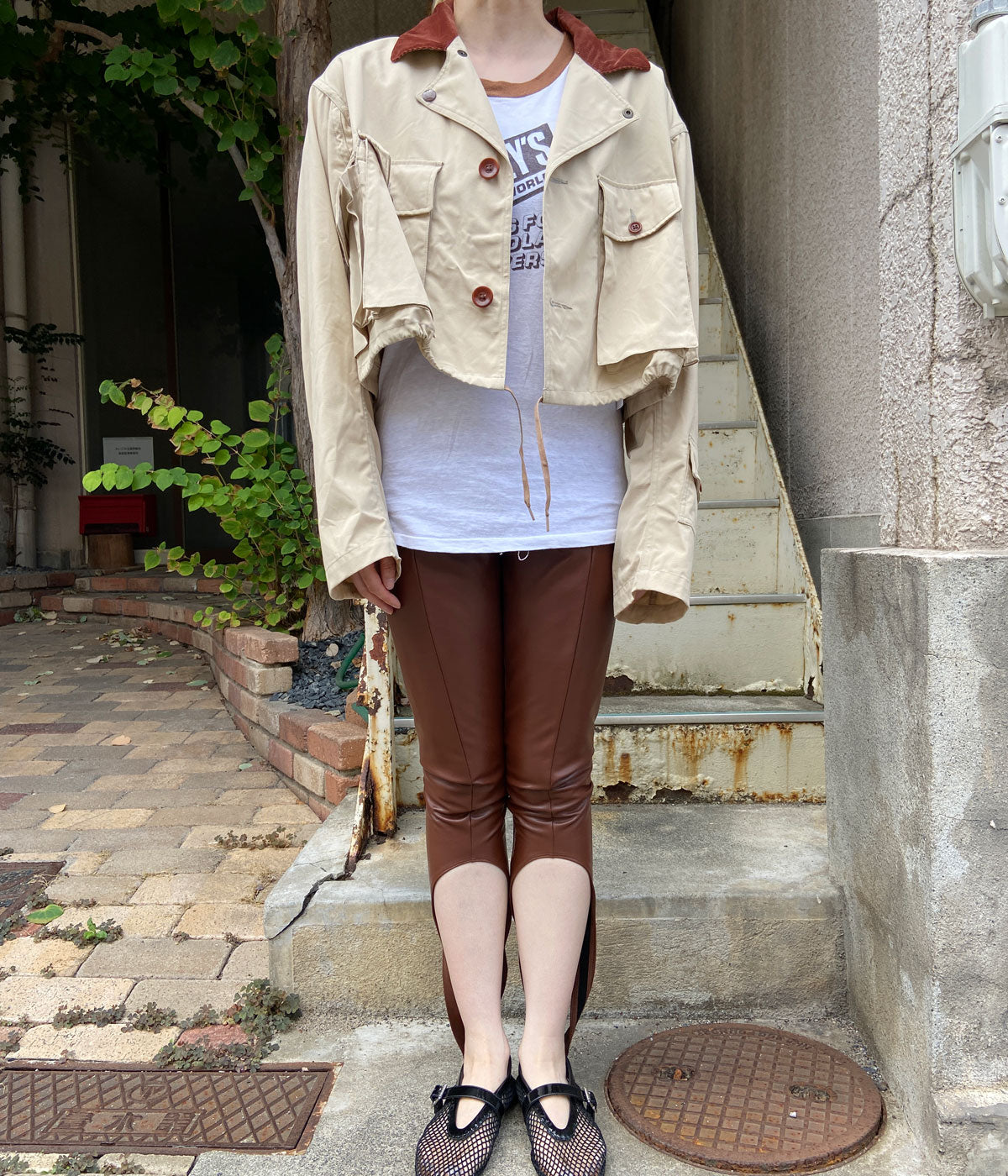 FUMIKA_UCHIDAからSTRETCH VEGAN LEATHER STIRRUPS LEGGINGSが入荷しました。リサイクルヴィスコースをベースに使用したストレッチヴィーガンレザーで作るハイウエストトレンカレギンス。素材やストッキングとのレイヤードがしやすい様、広めなトレンカ部分の開き。