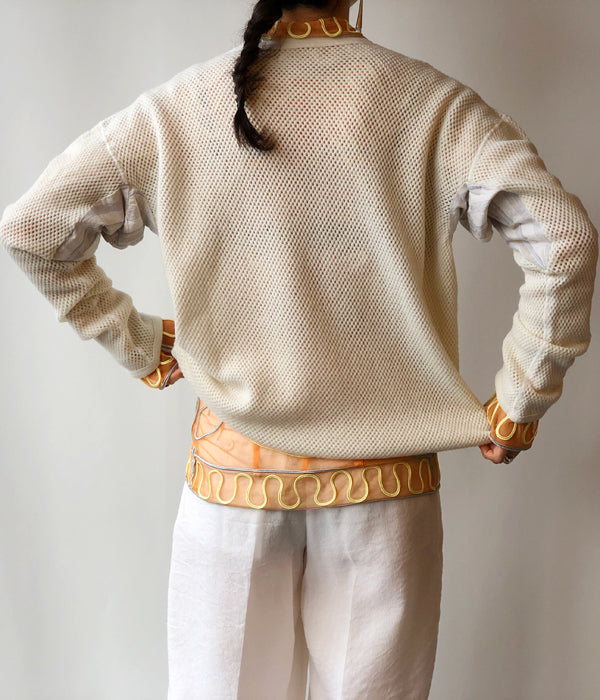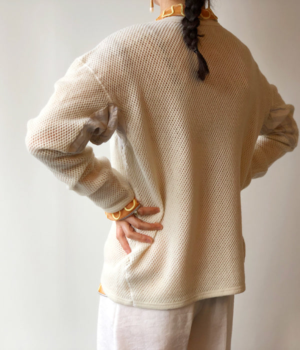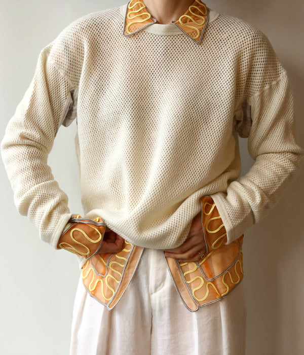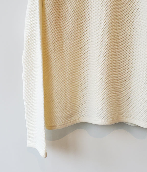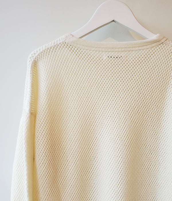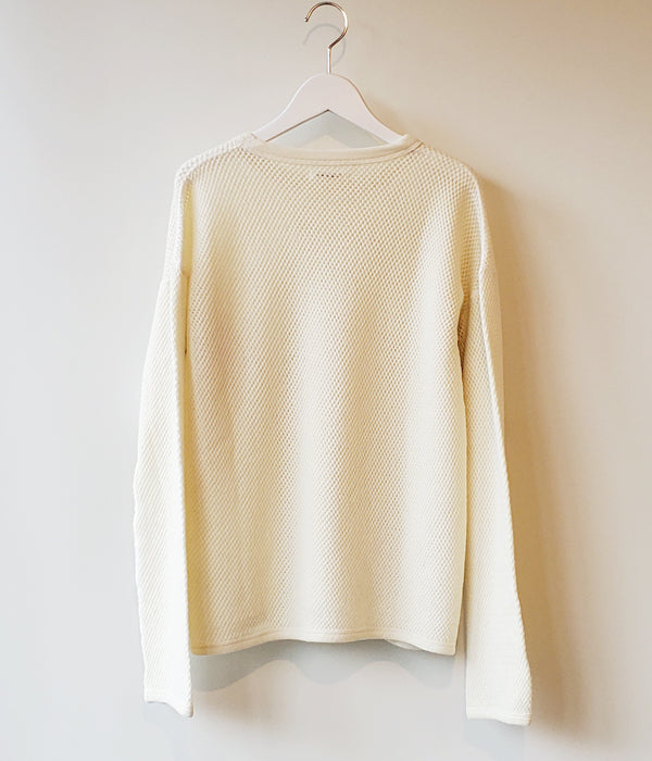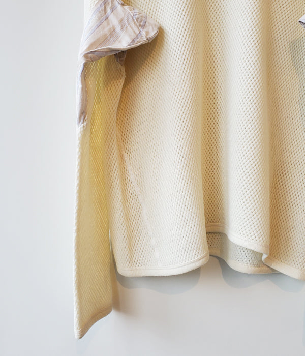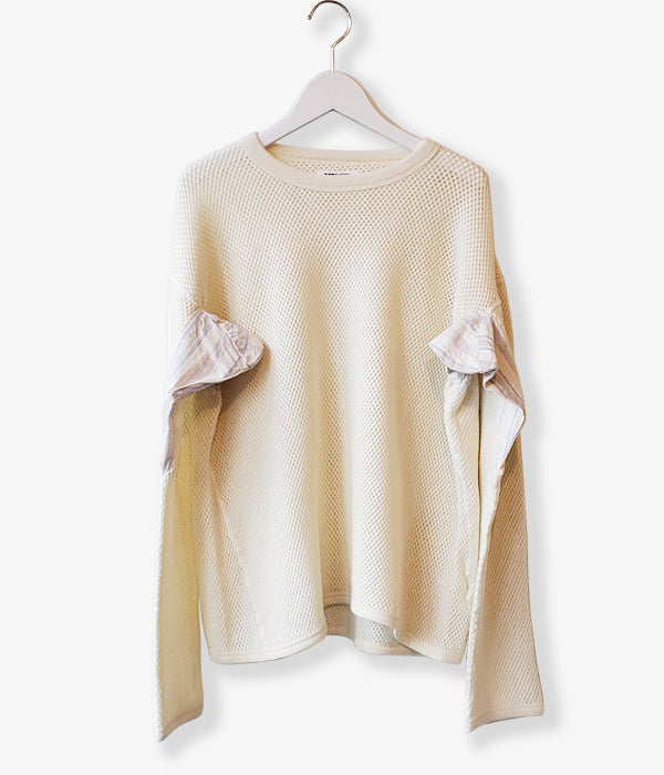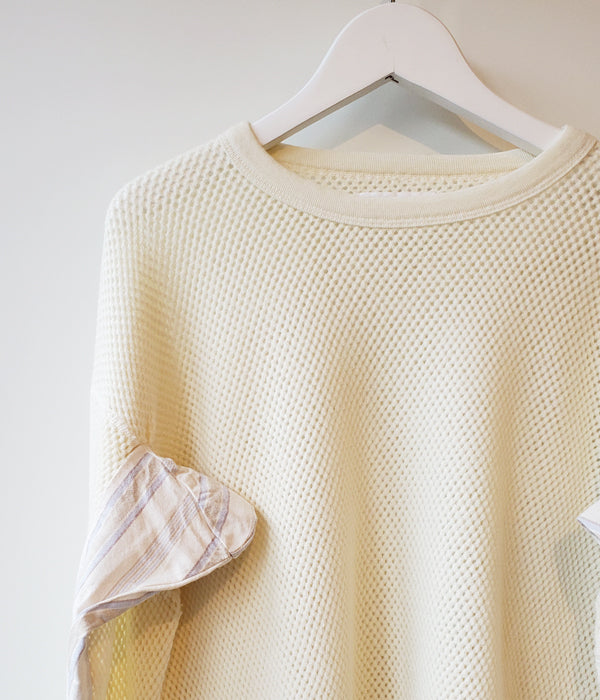 FUMIKA_UCHIDAからStriped Flannel Wool Mesh LONG-SLEEVE THERMALが入荷しました。ウール素材のメッシュ生地とストライプフランネルで作られたサーマルカットソー。縮んで小さくなった洋服の身幅を広げるためにマチをつけ、直して着るという古い時代の雰囲気を持たせたデザインです。ゆとりのある身幅に付くマチは縮んだようにギャザーが入り、裾は歪んだアウトラインに。製品加工の為、生地の表情やサイズに違いがあるのもデザインのひとつと捉えたITEMとなります。