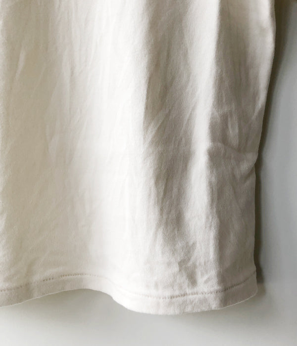 FUMIKA_UCHIDAからTRIMMED DOUBLE-NECK TEEが入荷しました。ヨーロッパのヴィンテージの子供服に使われるような、柔らかい伸びのあるスムース組織のカットソー生地を使用して作成したトリミングTシャツ。編地の特性で柔らかく風合いも良い生地に仕上がっています。昨年人気のあったネックフロントに1本のラインが通るデザイン。今シーズンはリングTでの展開です。