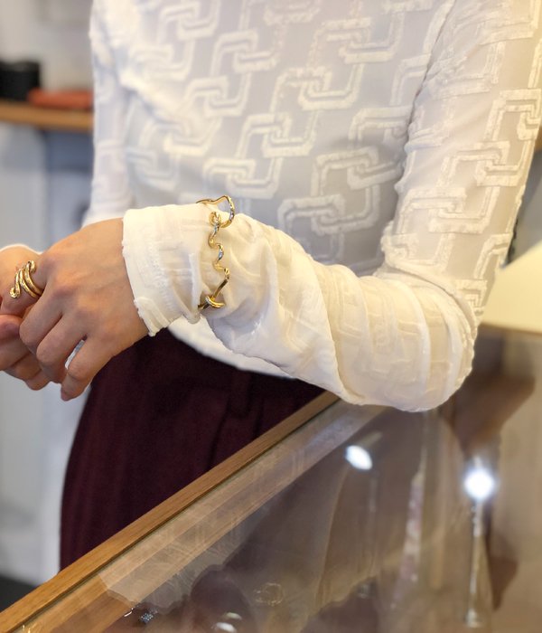 FUMIKA_UCHIDAからVELOUR JACQUARD BODYSUITが入荷しました。チェーンを表した古典的な和柄を、レーヨンの光沢が美しいベルベットジャガードで表現したボディスーツ。優しいストレッチ感としっとりと肌に馴染む着心地。肌を通した時に柄が浮き上がるように見え、その立体感ある陰影が美しい一枚。
