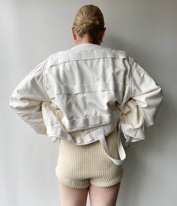 FUMIKA_UCHIDAからWOOL RIBBED BLOOMER SHORTSが入荷しました。ブランドのアイコニックな存在のブルマーをあえてアンダーウェアらしいオフ白で作成。ナチュラルな表情とボリューム、適度な垂れ具合で抜け感を演出してくれるアイテムです。未完成なバランスを楽しむコーディネートに効果的。