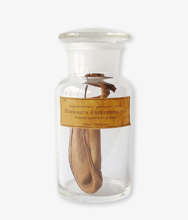 試薬瓶の中に乾燥植物を収納したGLASS CONTAINER Botanical( グラスコンテナ ボタニカル)。国内で数社、そこで働く僅かな職人さんのハンドメイドにて試薬瓶は作られています。過去に生物学者が植物を入れて標本にしていた事をヒントに、普段あまり見かけない乾燥した植物を収納しました。製壜業界と植物の再生をコンセプトにした博士の標本、お部屋のインテリアにいかがでしょうか?