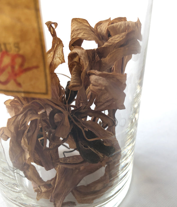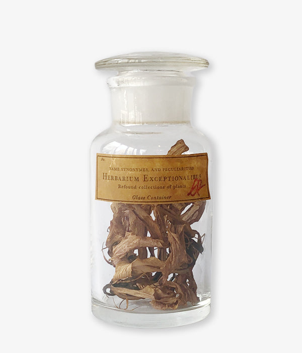 試薬瓶の中に乾燥植物を収納したGLASS CONTAINER Botanical( グラスコンテナ ボタニカル)。国内で数社、そこで働く僅かな職人さんのハンドメイドにて試薬瓶は作られています。過去に生物学者が植物を入れて標本にしていた事をヒントに、普段あまり見かけない乾燥した植物を収納しました。製壜業界と植物の再生をコンセプトにした博士の標本、お部屋のインテリアにいかがでしょうか?