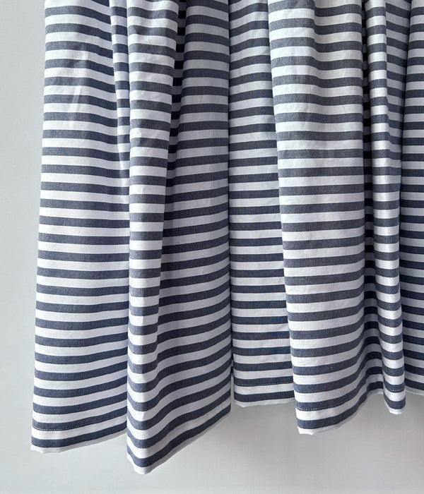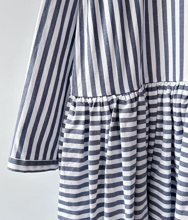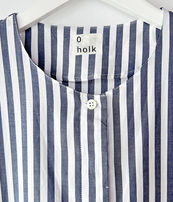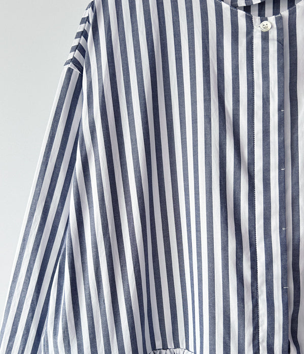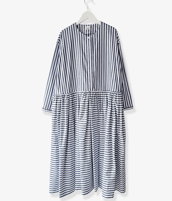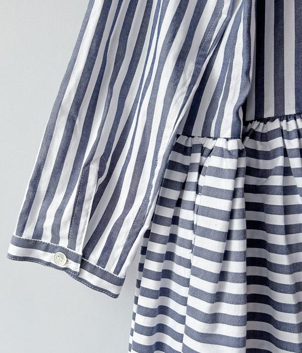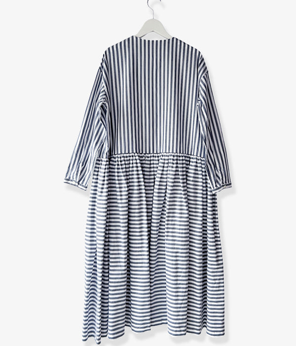 holkから、DRESSが入荷しました。ノーカラー、フライフロント仕立てによるプルオーバーワンピースです。小振りなカフスと、ウェスト周りに施したギャザーによる広がりのあるシルエットが特徴。サイドにポケットを設けました。ブルーグレーを基調としたストライプとボーダーの組み合わせによるカラーリング。
