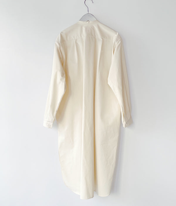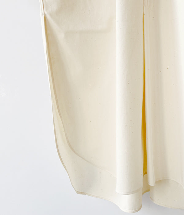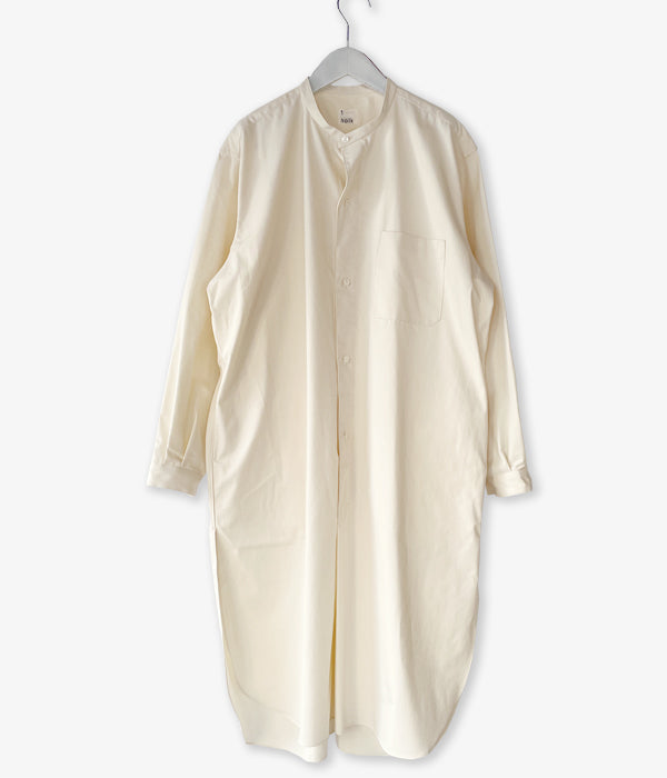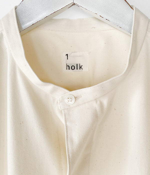 holkから、GRANPA SHIRTが入荷しました。キナリ晒しの生地の表面の黒い点々が表すように、原料に漂白を施すことを避けオーガニックに拘り抜いたナチュラルな風合いが特徴の1着。厚手の生地にゆったりシルエットのスタンドカラープルオーバーワンピ、背中にタックを多用し動きのあるシルエットを表現。両サイドにスリットポケット、バストのパッチポケットをアクセントに。
