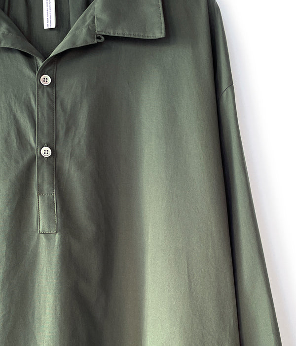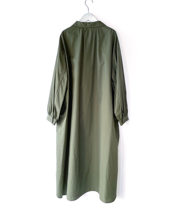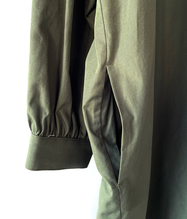 holkから、LONG BLOUSEが入荷しました。光沢感とつるっとした質感が特徴のコットン生地を使用したオーバーワンピ。ゆったりシルエットにオープンカラー仕立てのカジュアルな雰囲気と、プリーツを多用したバックスタイルと袖口がフェミニンなデザイン。両サイドにスリットポケットを備えます。深めにあしらったサイドスリットもポイント。