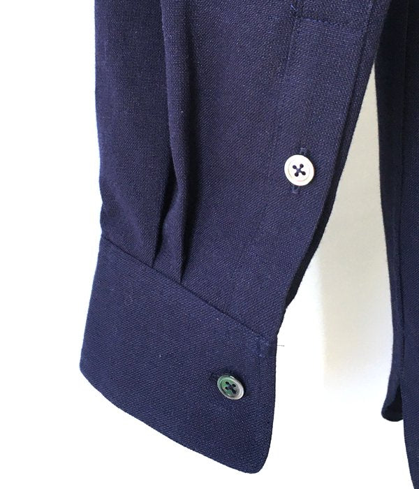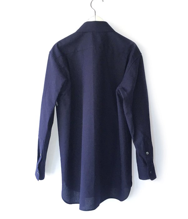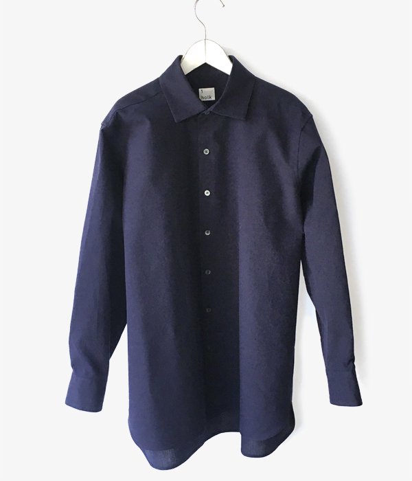 holkから、REGULAR SHIRTが入荷しました。コットン、ポリのミックス素材によるドライな質感と、素材由来のふくらみのあるシルエットが特徴のシャツ。ホリゾンタルカラーに近い開きの広い襟がポイント。立体的に見えるサイドからのパターンがとても美しい一着です。