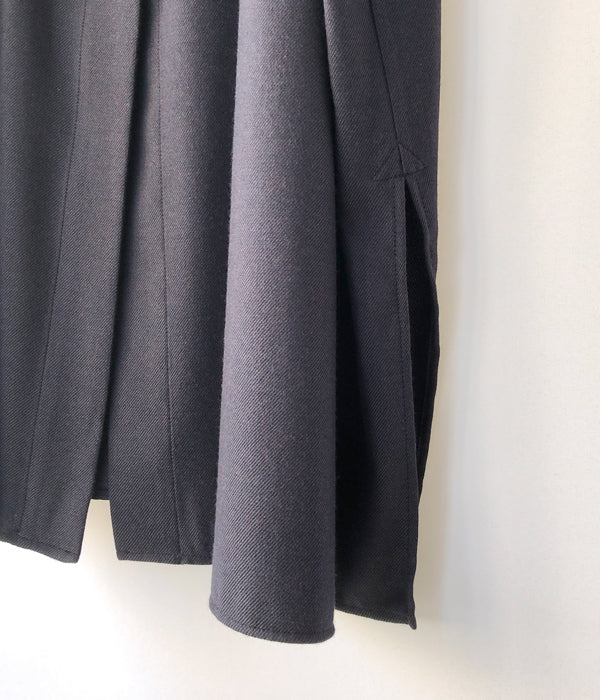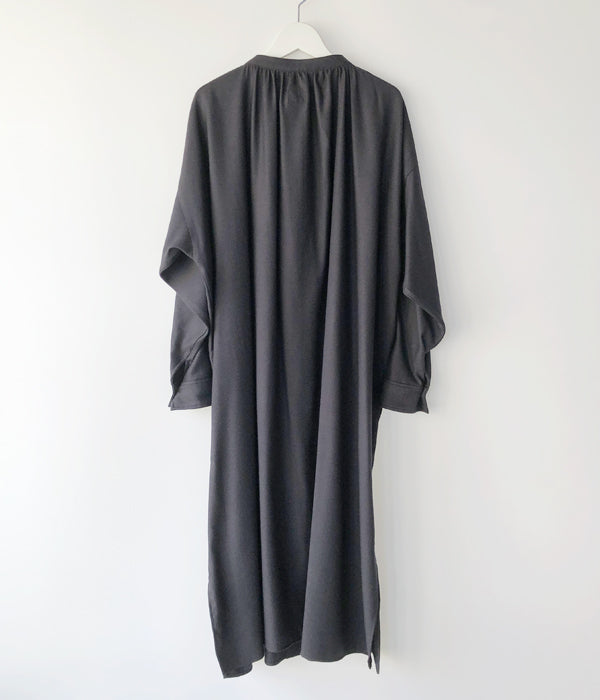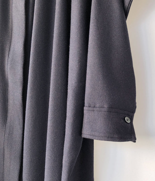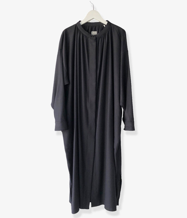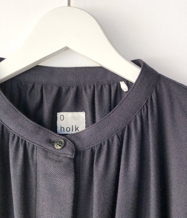 holkから、SMOCK DRESSが入荷しました。ウール x レーヨンで柔らかくドレープ感が楽しめる素材を使用したスタンドカラーワンピース。比翼仕立ての前開き、カフスデザインの袖口、サイドラインに沿ったポケット付き。裾両サイドに深めのスリット入り。シルク素材が入り高級感をプラス。
