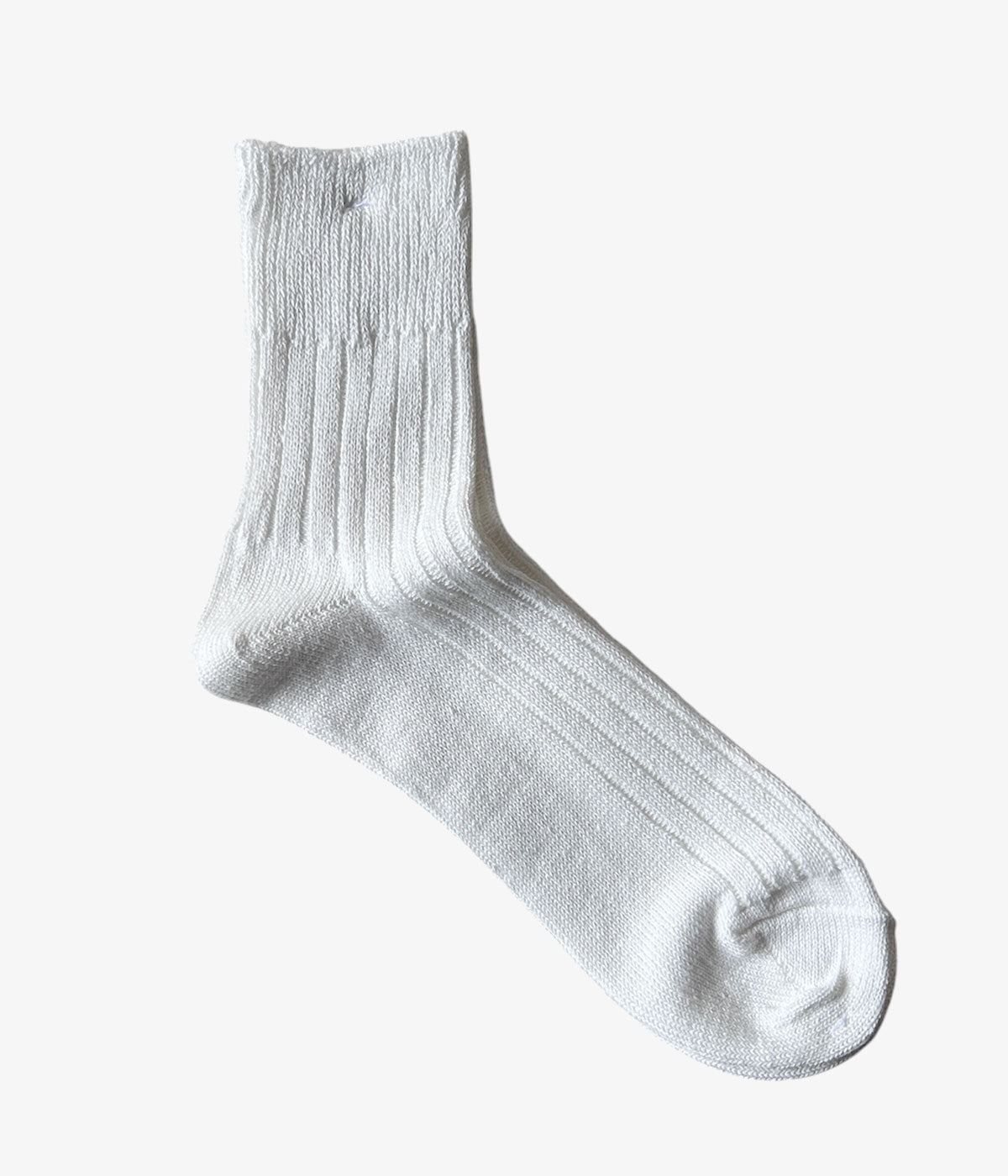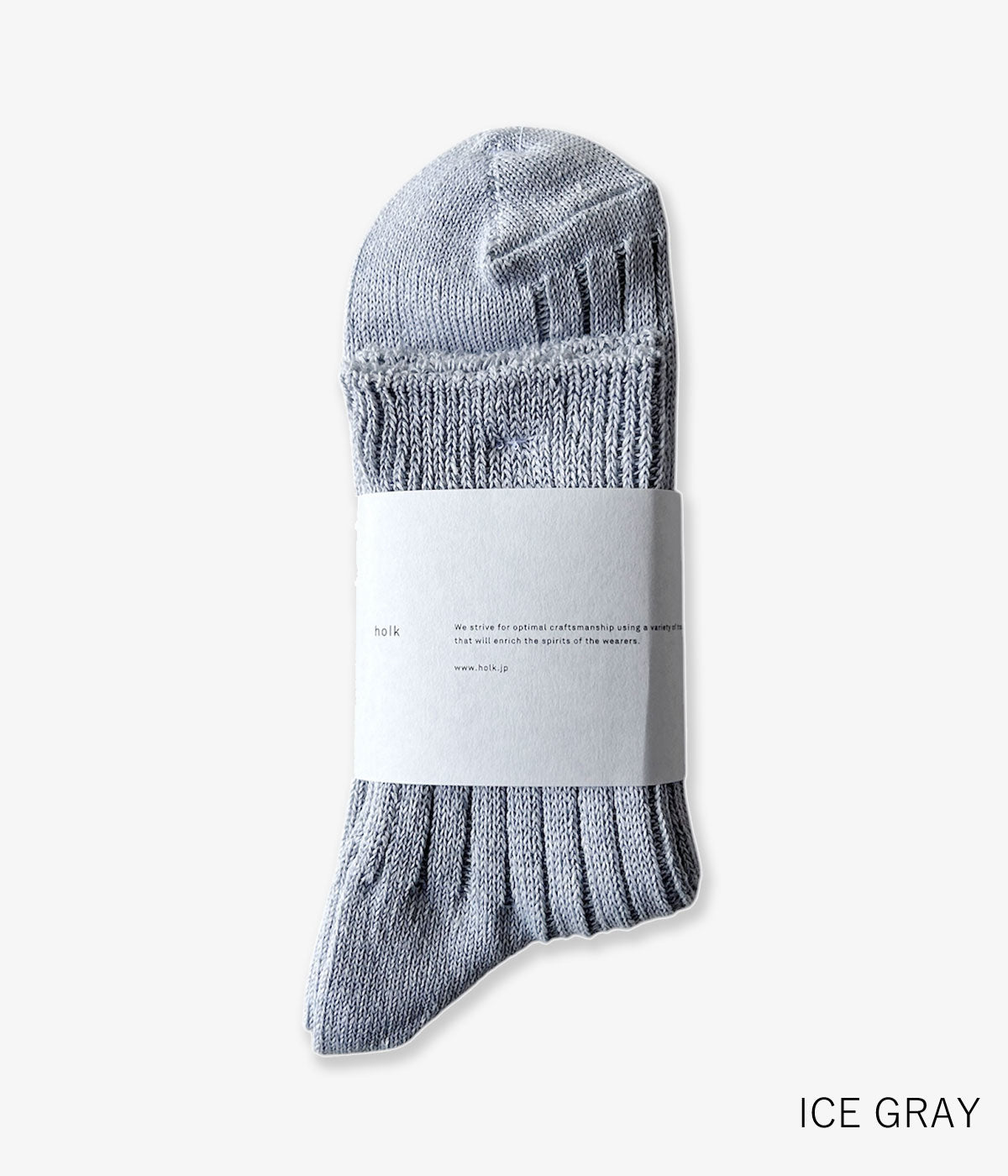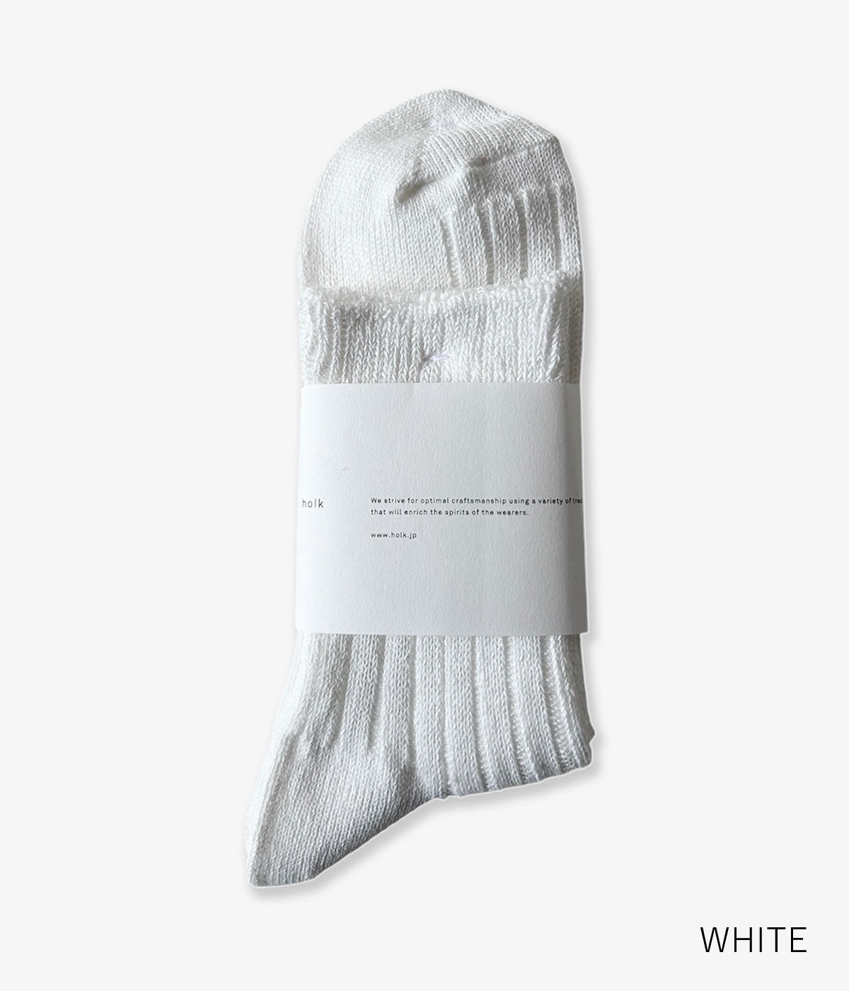 holkから、SOCKSが入荷しました。リブ編み仕立てのシンプルな無地クルーソックスです。リネンとポリ素材をブレンドした柔らかく、さらっとした質感の贅沢な履き心地の靴下です。ホワイト、グレー、ブラックの定番の3色展開。