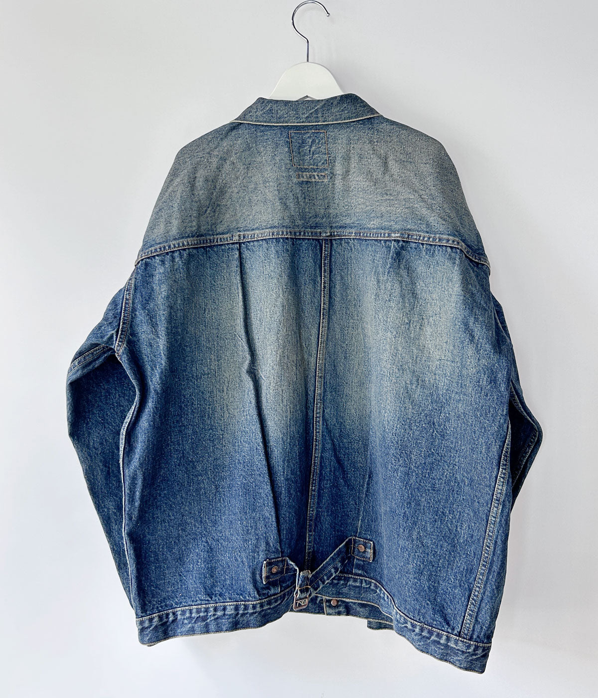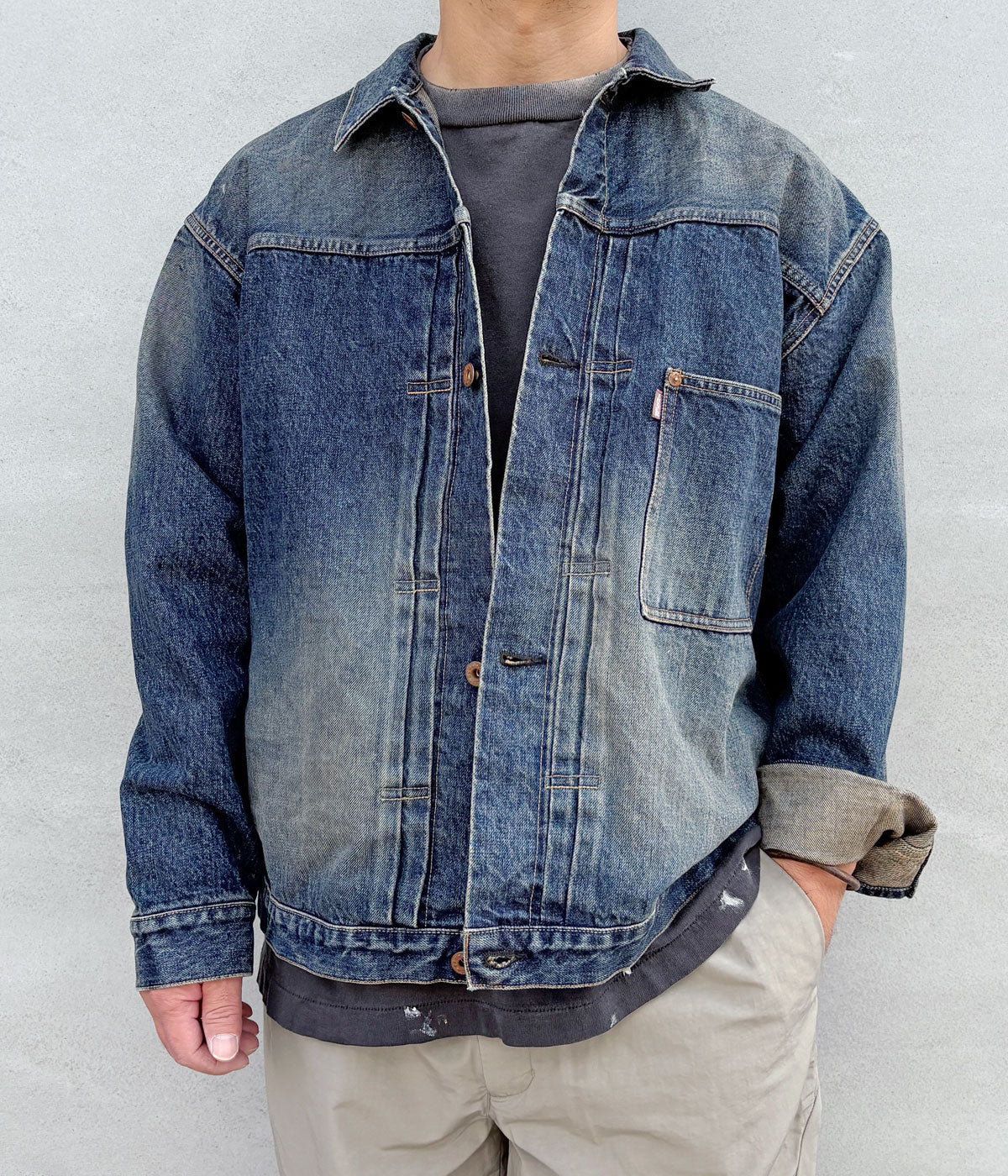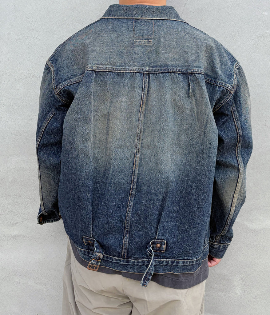 INTERIMから、CLASSIC HEAVY KIBATA SHUTTLE HYPER BIG WWII "1ST" DENIM JACKETが入荷しました。1st仕様のデニムジャケット(大戦モデル)をベースにビッグサイズにアレンジされた1着。前立てとカフスには鉄製ボタンを採用し、INTERIMネーム入りのレーヨン製ピスネーム、ビッグサイズならではのTバックスタイルなど非常に完成度の高い仕上がり。長年にわたって着込み、十分に経年変化した質感を表現してあります。