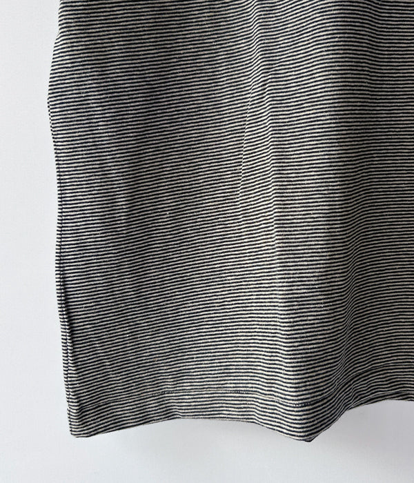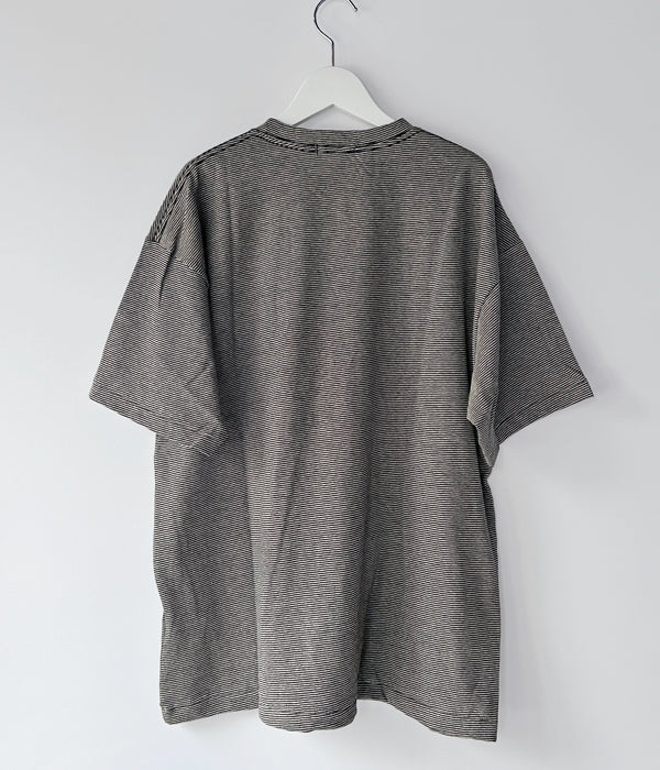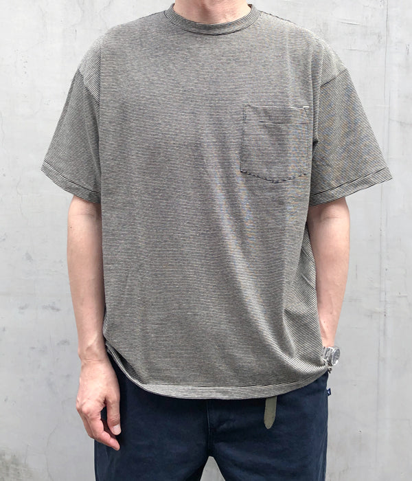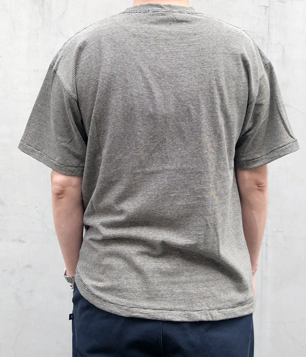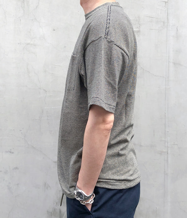 INTERIMから、COTTON HEMP BORDER POCKET TEEが入荷しました。コットンとヘンプを掛け合わせた素材を使用したボーダーTシャツ。細かいピッチで表現されたボーダー柄に、ネップ感漂うヘンプならではの粗野な質感がマッチします。伸縮性に優れたニットのような質感が特徴の1着。バストポケットを備えたデザイン。