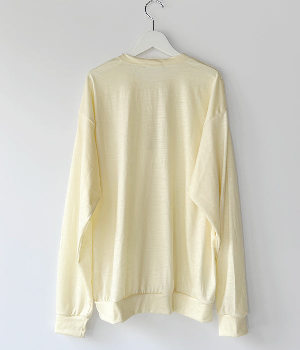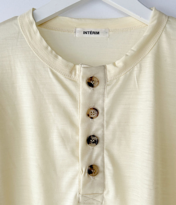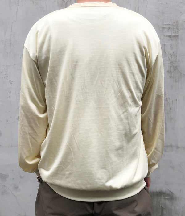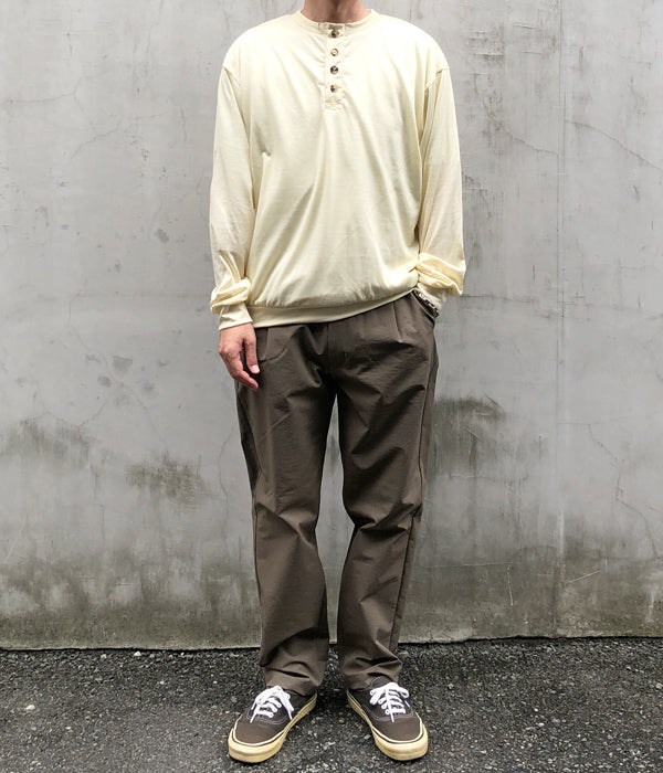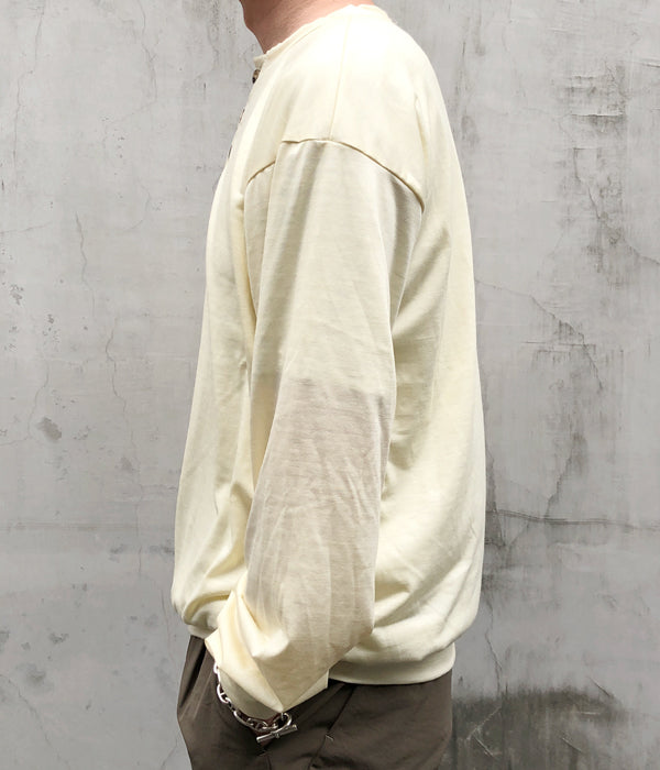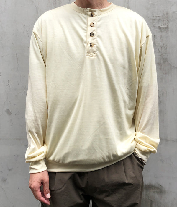 INTERIMから、EXTRA FINE MERINO WOOL JERSEY HENRYが入荷しました。エクストラファインメリノを使用したウール天竺素材を使用したヘンリーネック。インナーから、1枚での着用までを想定した作りでチクチク感もなく、光沢がありドレープ感が美しい高級感のある1着です。リブ付きのデザインに、光沢のある水牛ボタンがポイント。