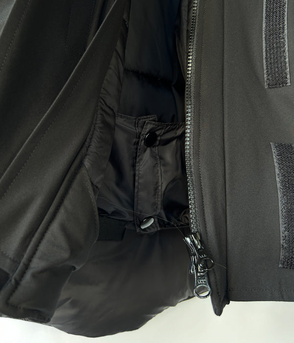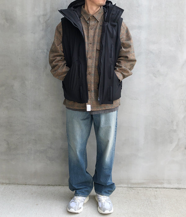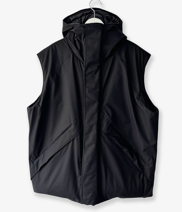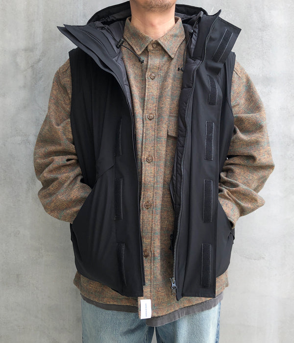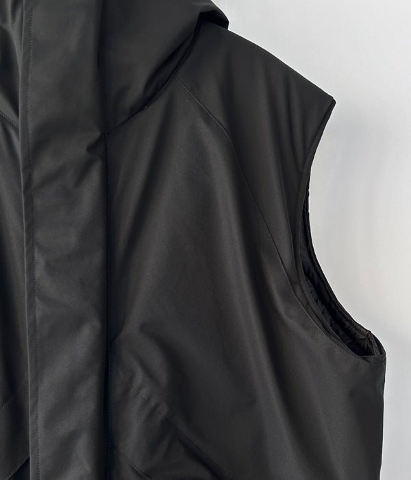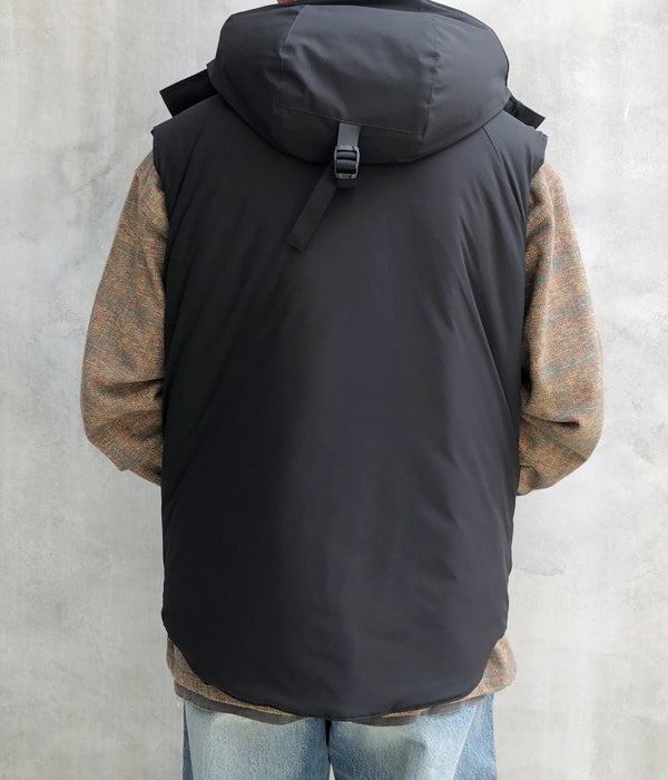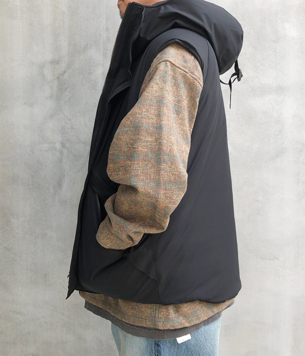 INTERIMから、HYPER BIG HI-LOFT WATER PROOF INSULATED HOODED VESTが入荷しました。80-90年代のアメリカにおいて、タフな環境に従事するワイルドな人々からの支持を集めた某ブランドの某ジャケットをモチーフに仕立てた中綿ジャケットのベストVer.。表地には最⾼レベルの防⽔性、透湿性、低結露性を誇るダーミザクス素材、中綿にシンサレートハイロフトを採用し、最新鋭の機能素材を取り⼊れてアップデート。フード周り、裾周りに機能的なアジャスター機構を備え、裏地のウエスト周りには今では珍しいスノースカートのディティール。大きなポケットに、ダブルフライフロント仕⽴て。