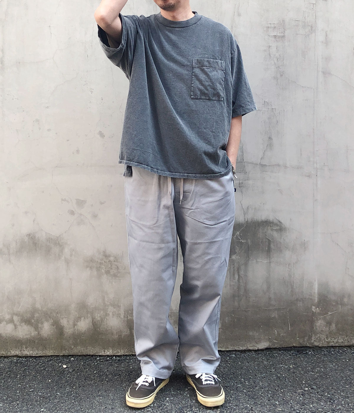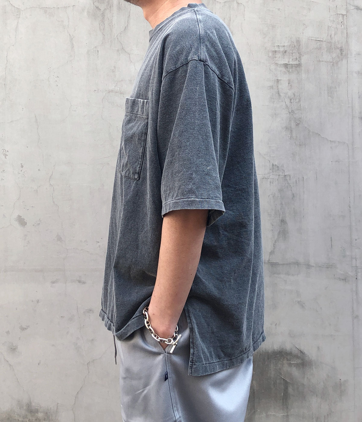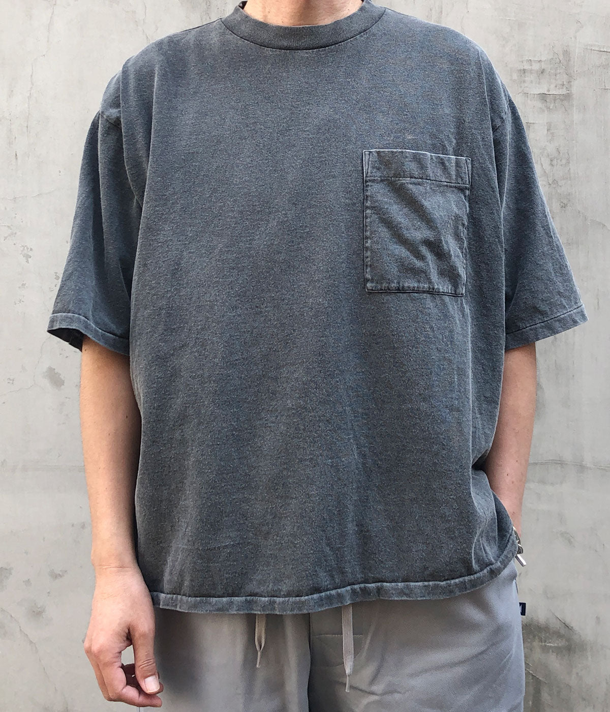 INTERIMから、HYPER BIG VINTAGE FADE BLACK POCKET T-SHIRTが入荷しました。アメリカっぽいタフでビッグなTシャツをモチーフに、全体的に大きな寸法で仕立てたBIG T-SHIRT。サイドにスリットを施し、ネック周りは強度の高いタコバインダーを採用し、全体的なバランスを考慮し計算された短めの着丈がポイント。ブリーチ処理で表現したフェード感のあるカラーリングが美しい1着。