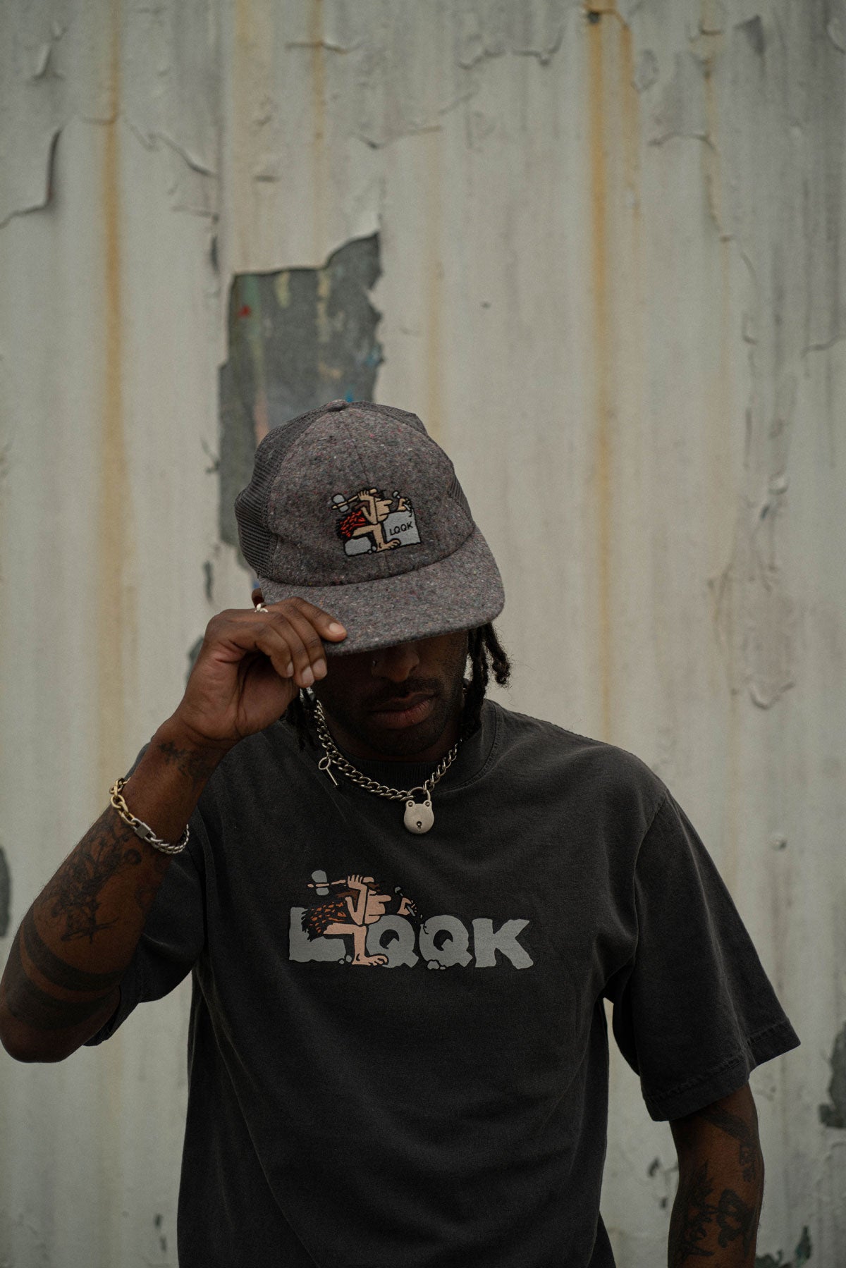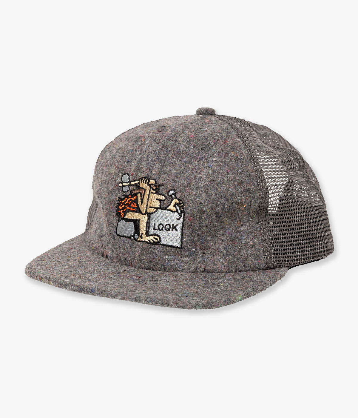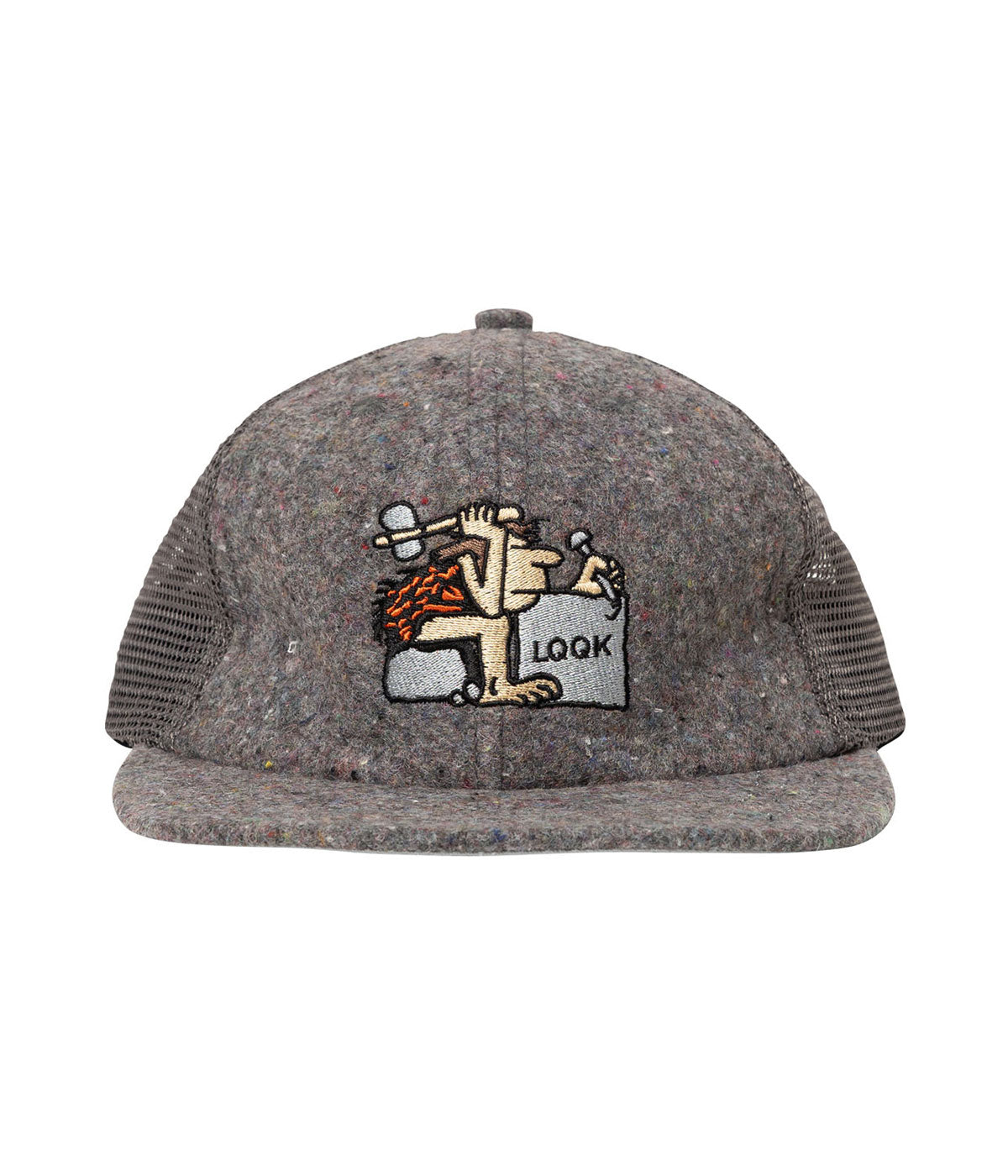 LQQK Studioから、CAVEMAN LOGO CAPが入荷しました。フロントに原始人のイラストをかわいく刺繍したスナップバックキャップ。WOOL × ポリメッシュによるクラウンの切り替えがポイント。バイザー裏にはお馴染みのLQQKの刺繍入り。アジャスター調整可能。