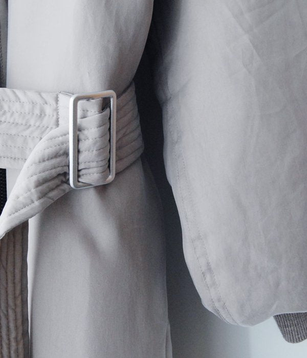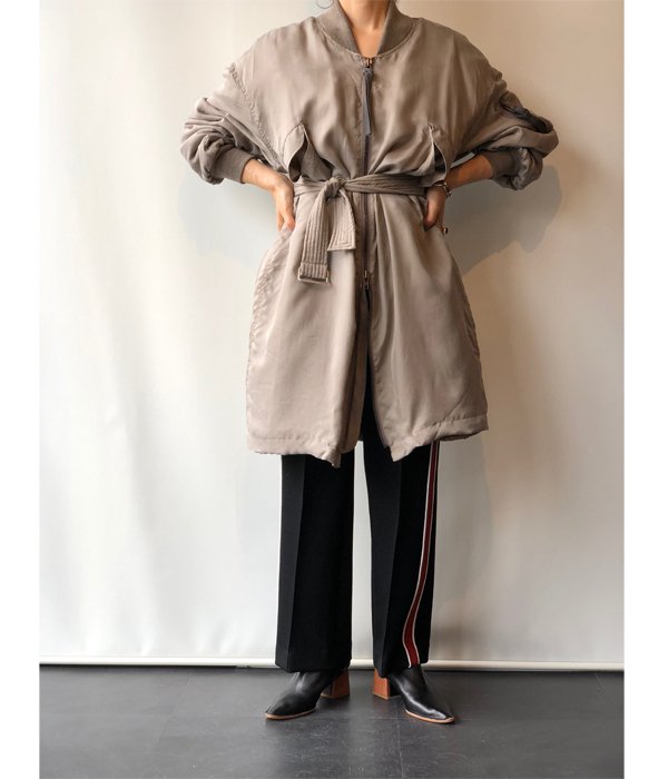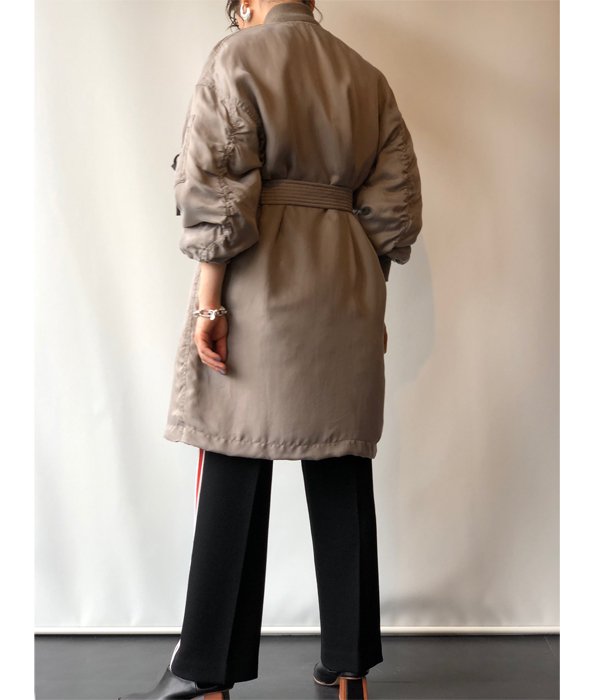 ブルゾンとコートが合体したオーバーサイズな中綿入りライナー付コート。そのまま着ても良し、付属のベルトでウエストをぎゅっと絞ってシルエットの変化を楽しんで着るも良し。ヴィンテージ感のある生地、大きくドロップした肩に太い袖がメゾンエウレカらしい拘りのデザインが見られます。軽くて温かいという機能性も兼ね備えているところもポイント。
