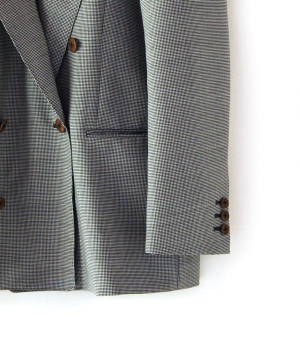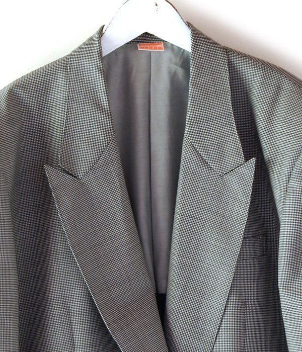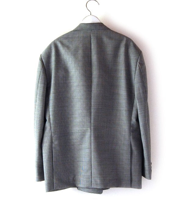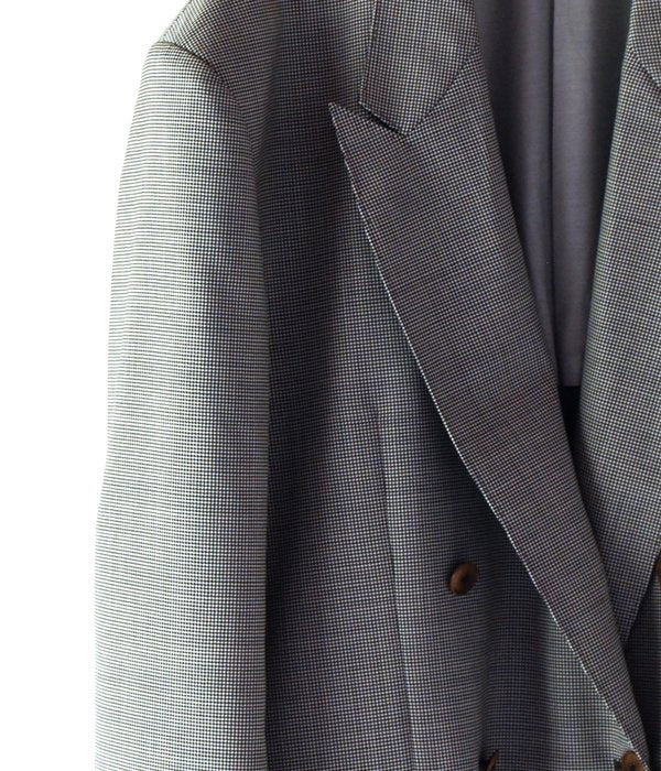 太めのラペルにダブル仕立てのTheブレザー。敢えていなたく着こなしたい一着。同素材のスラックスとのセットアップがおすすめ。