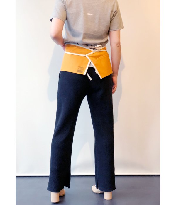 鮮やかなオレンジカラーにブランドロゴをのせたエプロン。こちらはボディを覆うように着用するTOP型。