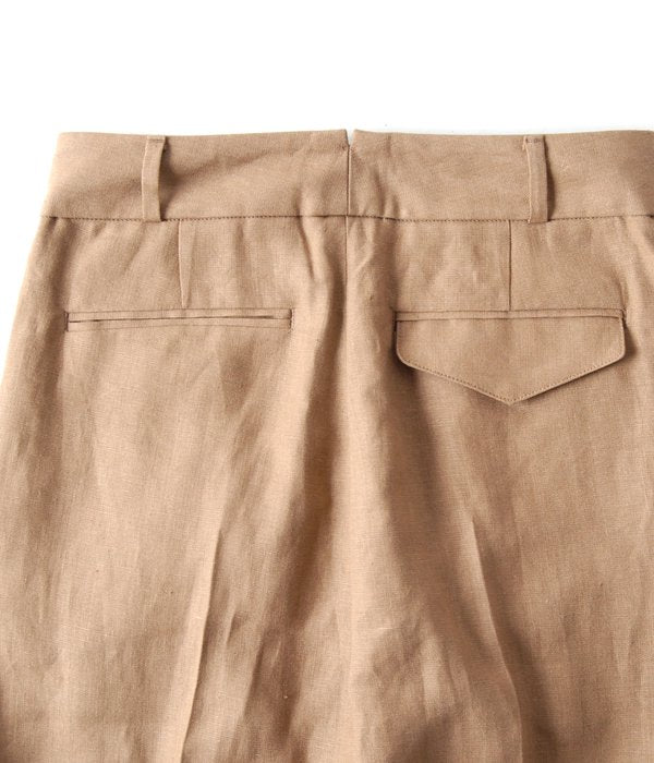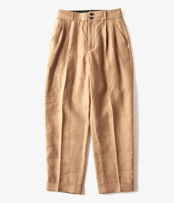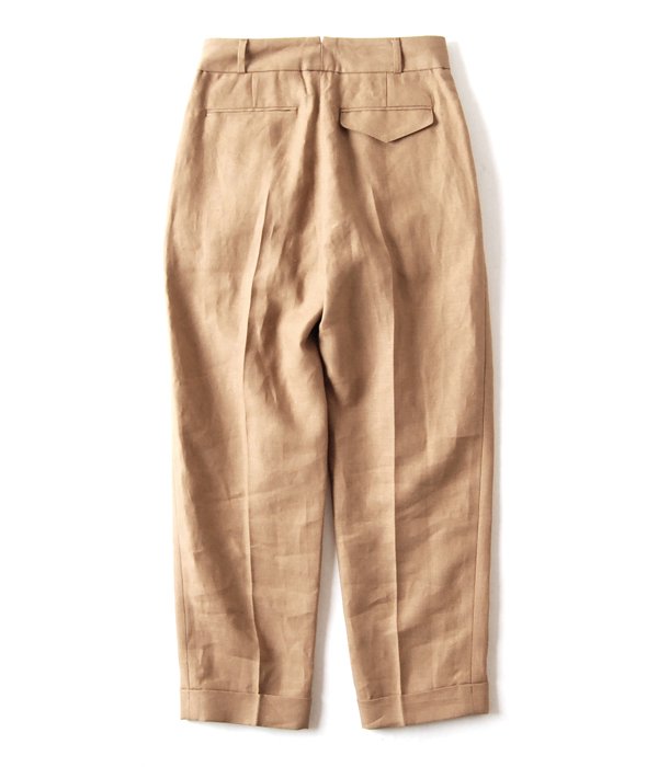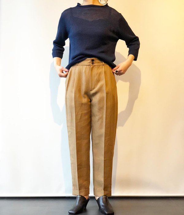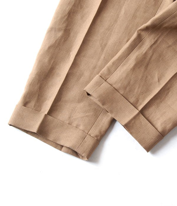 凸凹感のあるリネン素材を使用した表情が立体的なパンツ。やや高めのウェスト位置にツータック、裾はダブルで仕上げました。