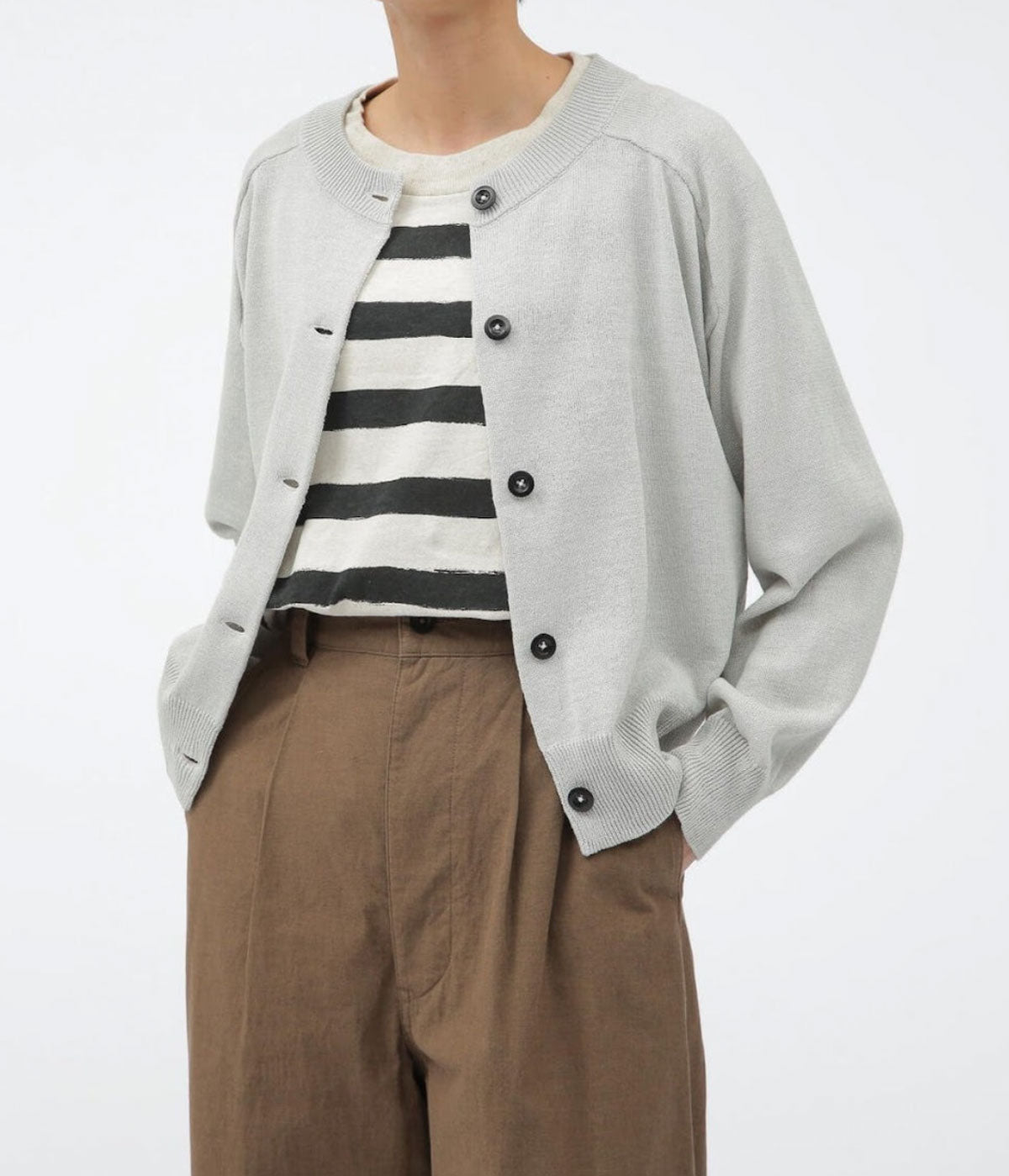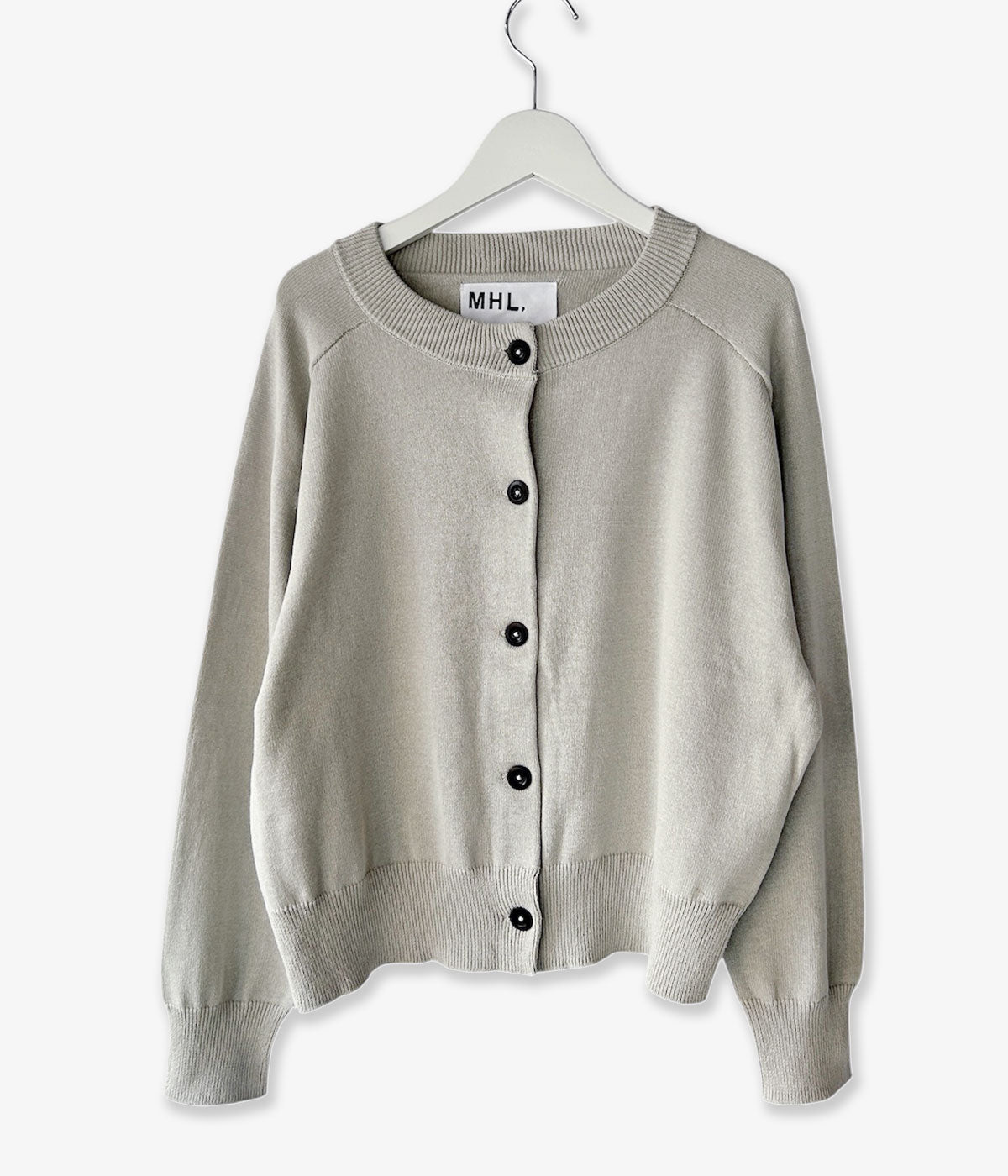MHL.から、COATED DRY COTTON CARDIGAN WOMENSが入荷しました。ドライな質感のコットンを使用したカーディガン。特殊なコーティングにより軽やかで型崩れしにくい上がりに。短めのすっきりとした丈を特徴に、肩回りの立体的な変形ラグランパターンが目を惹きます。