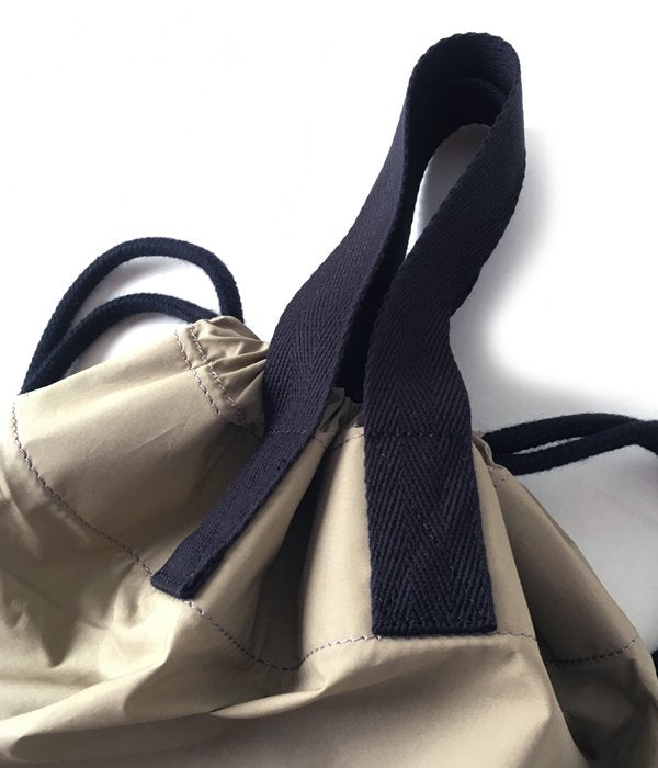 高密度で織り込まれたコットン生地に加工を施した、ナイロンのような質感のナップサックです。ワンポイントでMHL.のLOGOをプリントし、手持ち用の取っ手も用意してあります。