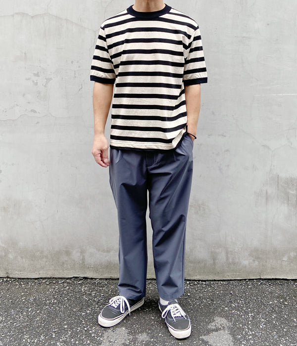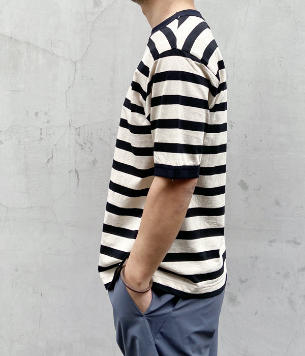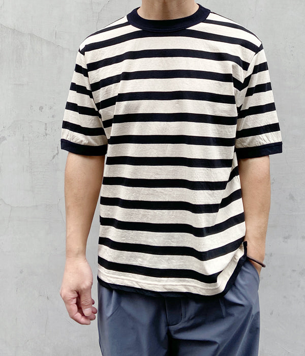 MHL.から、COTTON LINEN STRIPE JERSEY SSが入荷しました。リネンをミックスした清涼感のある質感のカットソー。太目のピッチがカジュアルな印象のボーダー柄。えり周りと袖口のフライスバインダーがさりげないアクセントに。裾にはスリットが入ります。