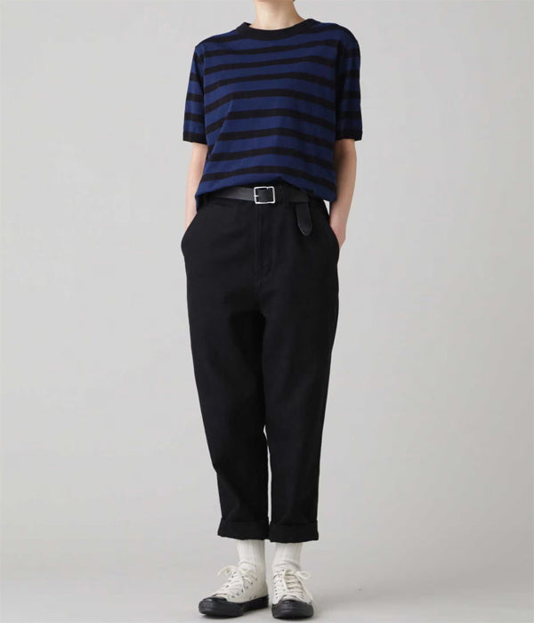 MHL.から、COTTON LINEN STRIPE JERSEY SS WOMENSが入荷しました。リネンをミックスした清涼感のある質感のカットソー。太目のピッチがカジュアルな印象のボーダー柄。えり周りと袖口のフライスバインダーがさりげないアクセントに。裾にはスリットが入ります。