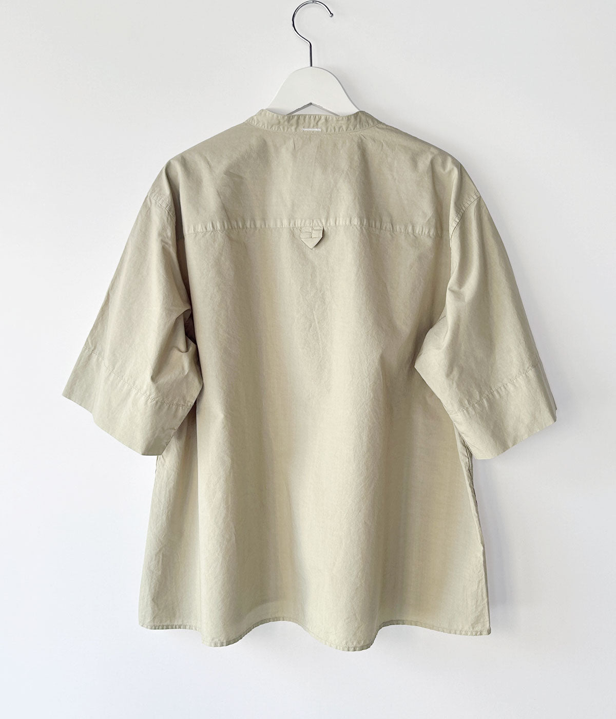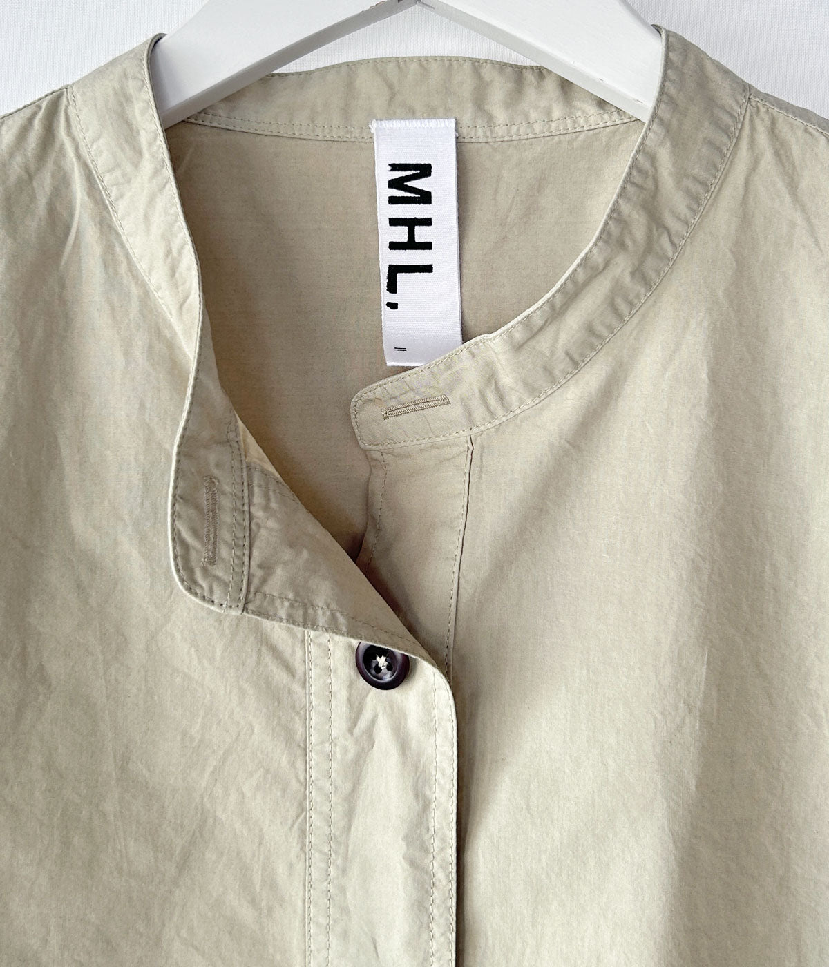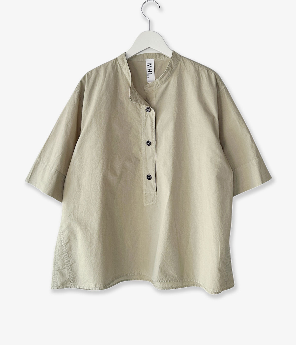 MHL.から、COTTON RAMIE POPLIN SS SHIRT WOMENSが入荷しました。コットンとラミーのミックス素材によるタイプライタークロスを使用した半袖シャツ。ノーカラーのリラックスしたサイジングに、ワイドヘムが特徴的なデザイン。フロントに3つの大きめボタンによるスタンドカラー仕様のプルオーバー仕立て。