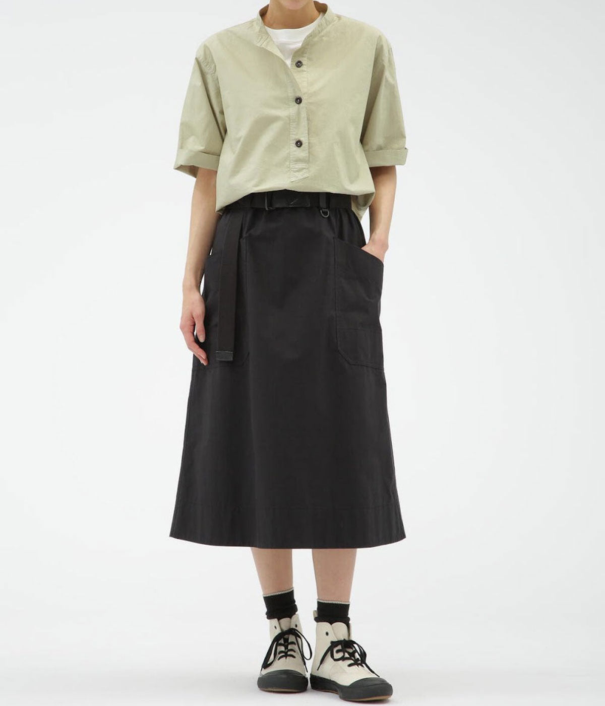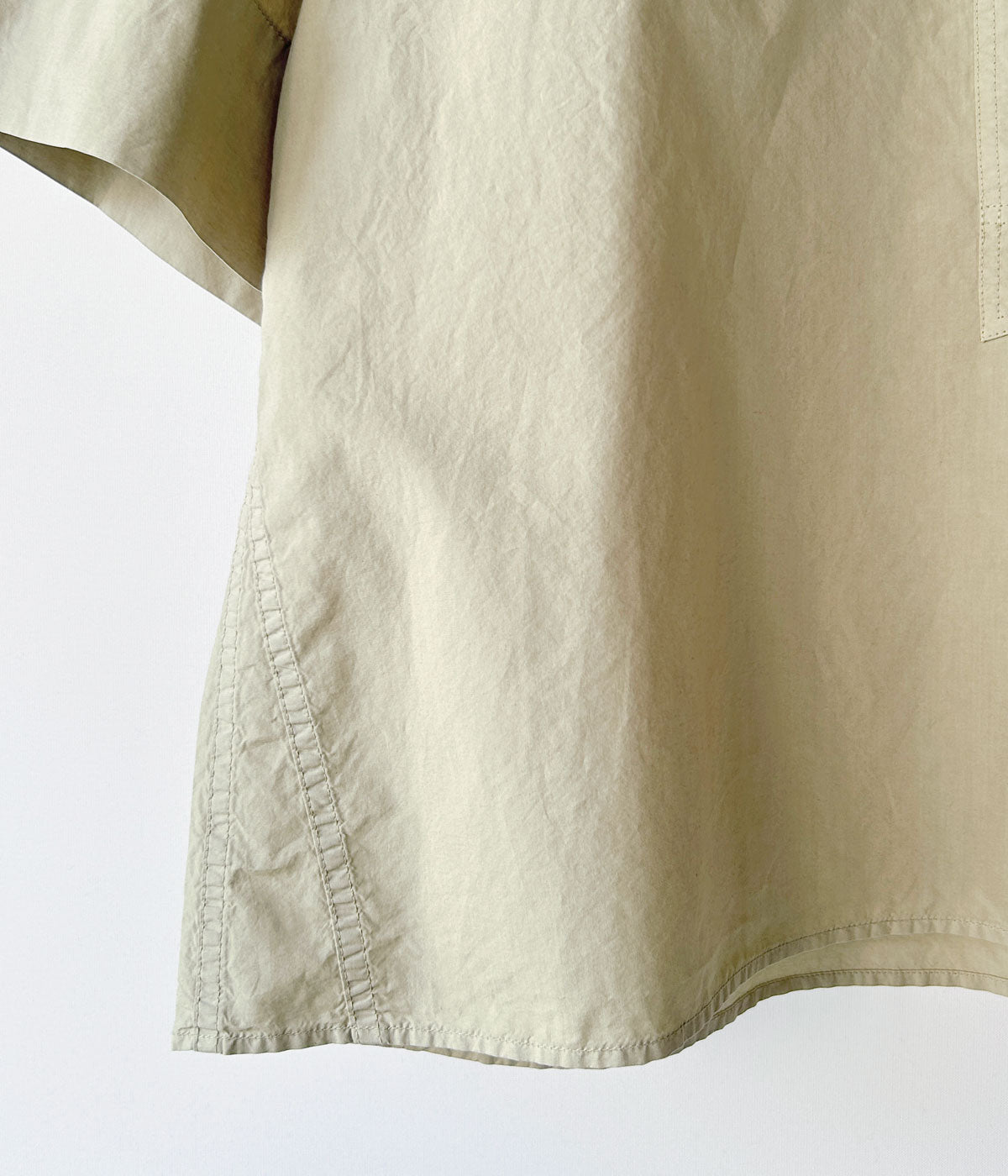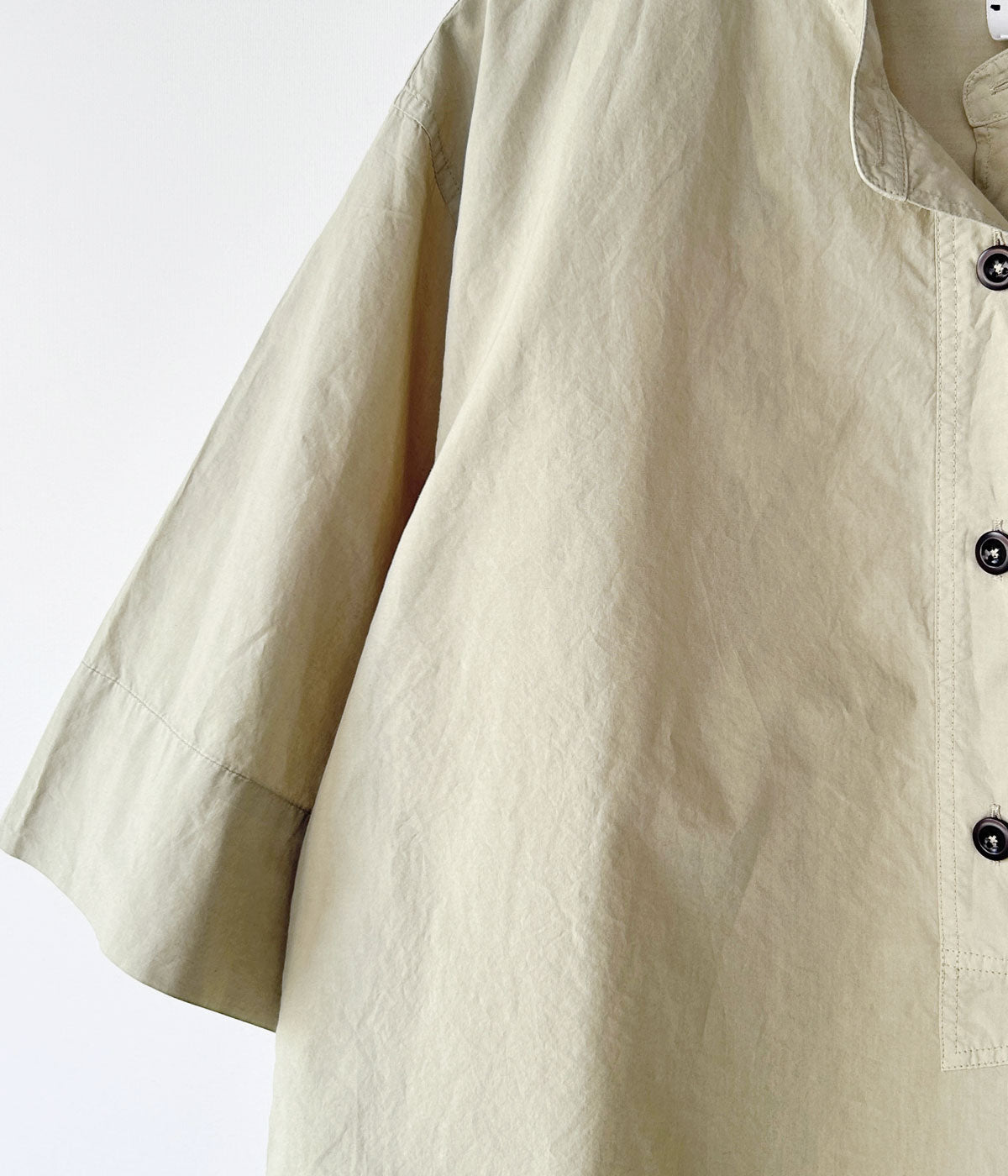 MHL.から、COTTON RAMIE POPLIN SS SHIRT WOMENSが入荷しました。コットンとラミーのミックス素材によるタイプライタークロスを使用した半袖シャツ。ノーカラーのリラックスしたサイジングに、ワイドヘムが特徴的なデザイン。フロントに3つの大きめボタンによるスタンドカラー仕様のプルオーバー仕立て。