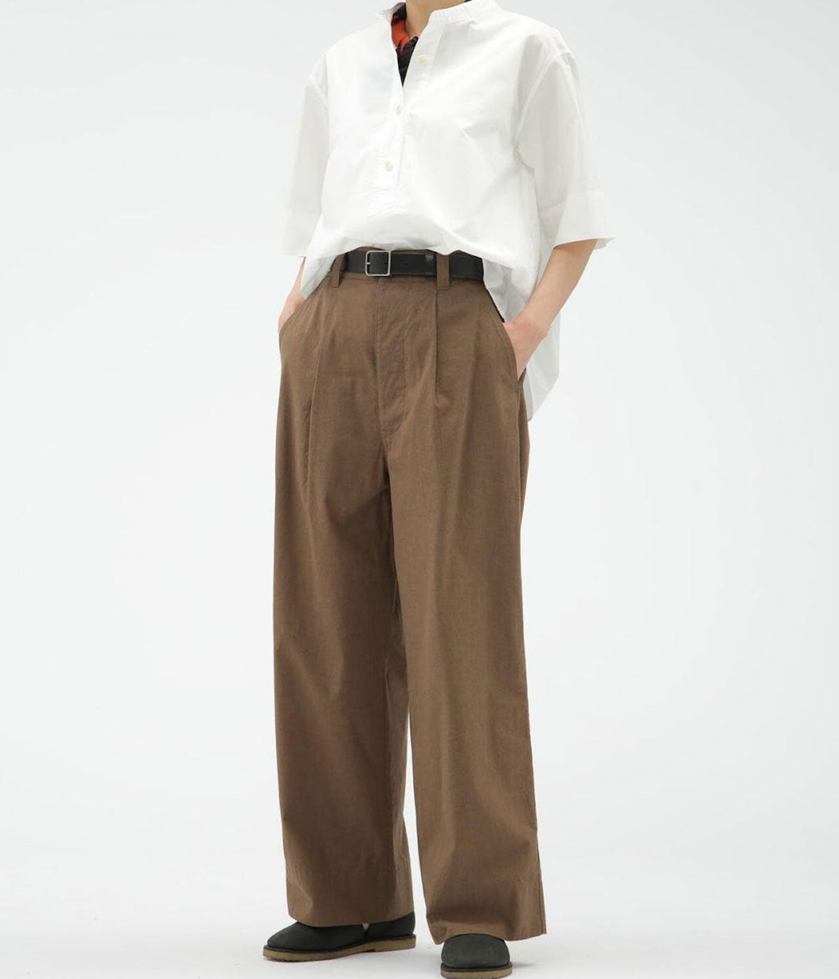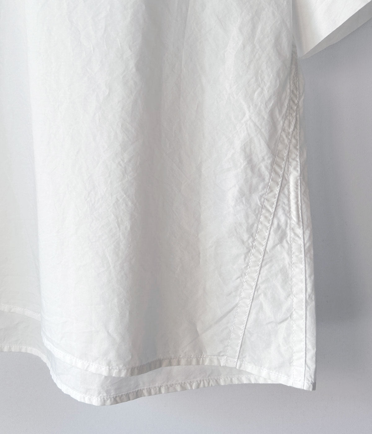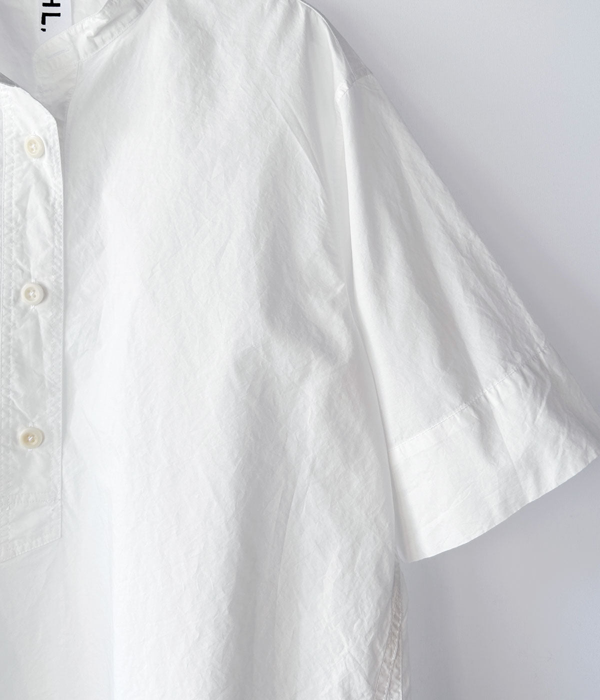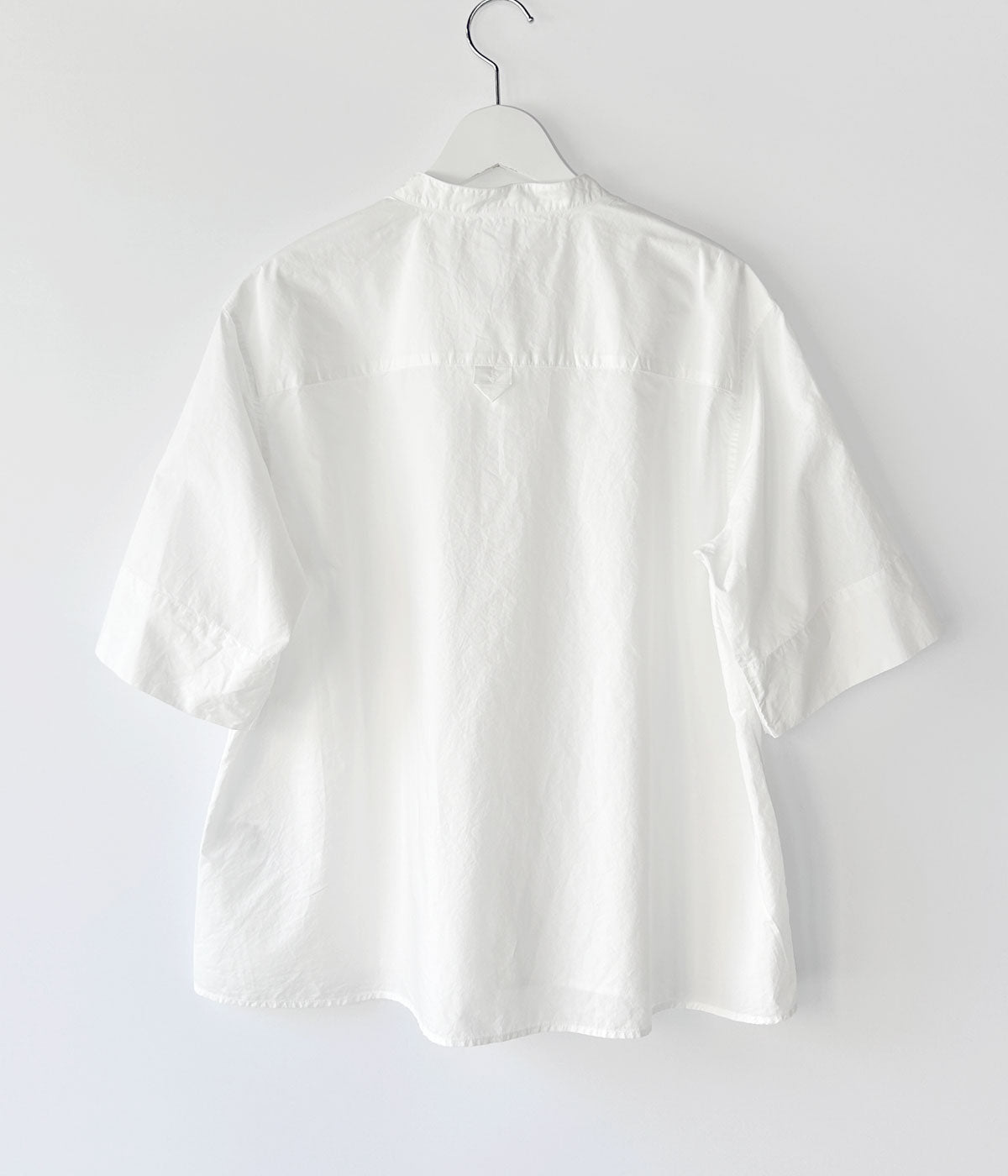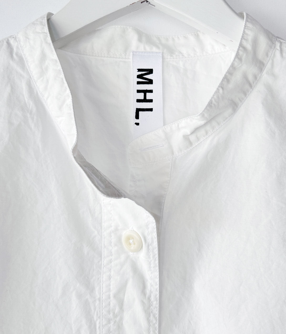 MHL.から、COTTON RAMIE POPLIN SS SHIRT WOMENSが入荷しました。コットンとラミーのミックス素材によるタイプライタークロスを使用した半袖シャツ。ノーカラーのリラックスしたサイジングに、ワイドヘムが特徴的なデザイン。フロントに3つの大きめボタンによるスタンドカラー仕様のプルオーバー仕立て。