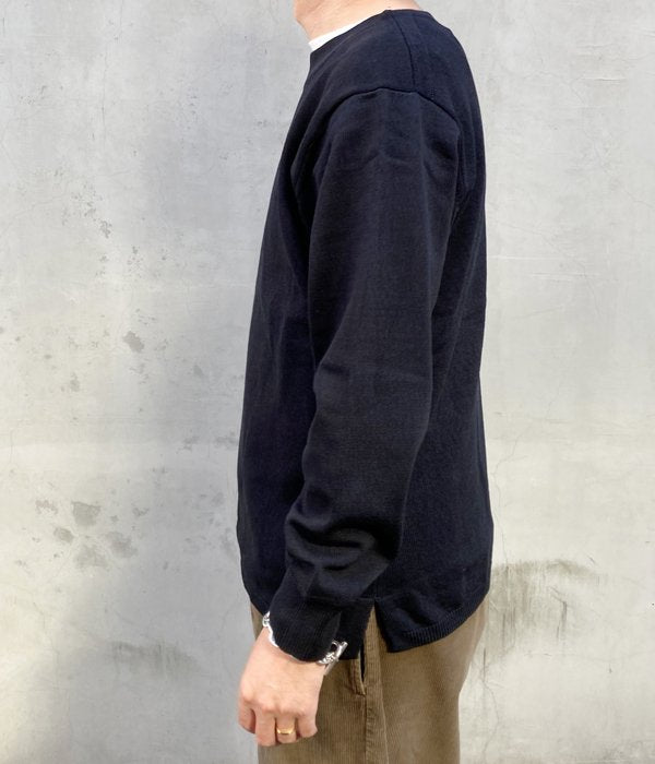 MHL.から、DENSE COTTON KNITが入荷しました。程よい厚みのあるさらっとした肌触りのコットン製ニットです。マットな首回りと裾口の控えめなスリットがポイント。ゆったりとした着回しのきくシルエット。
