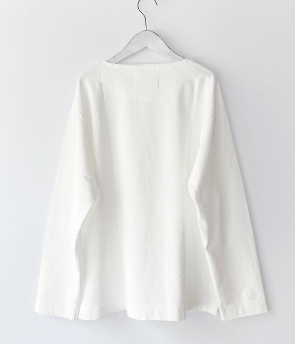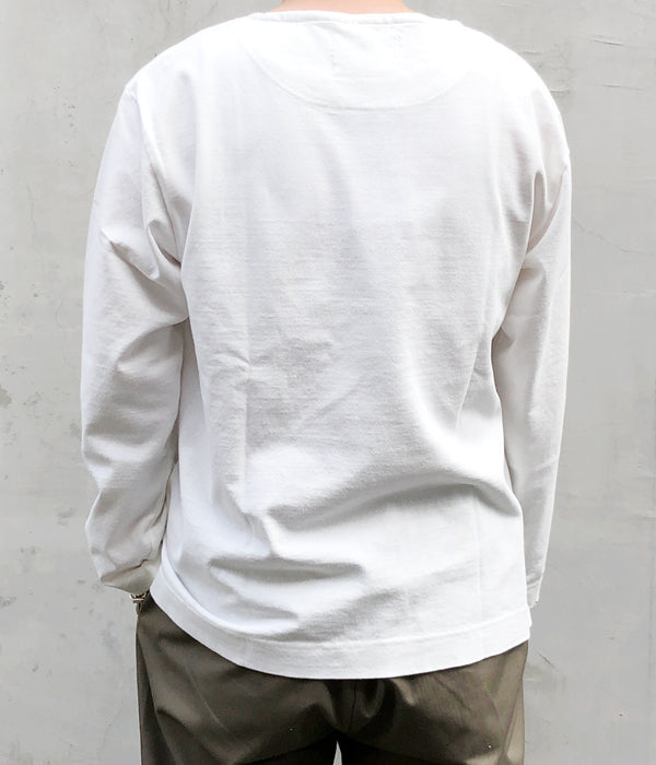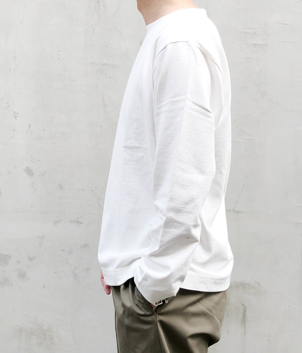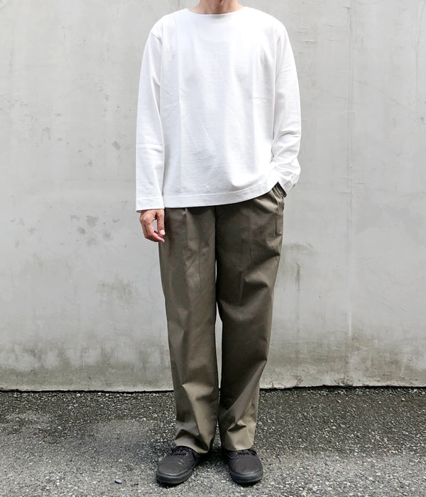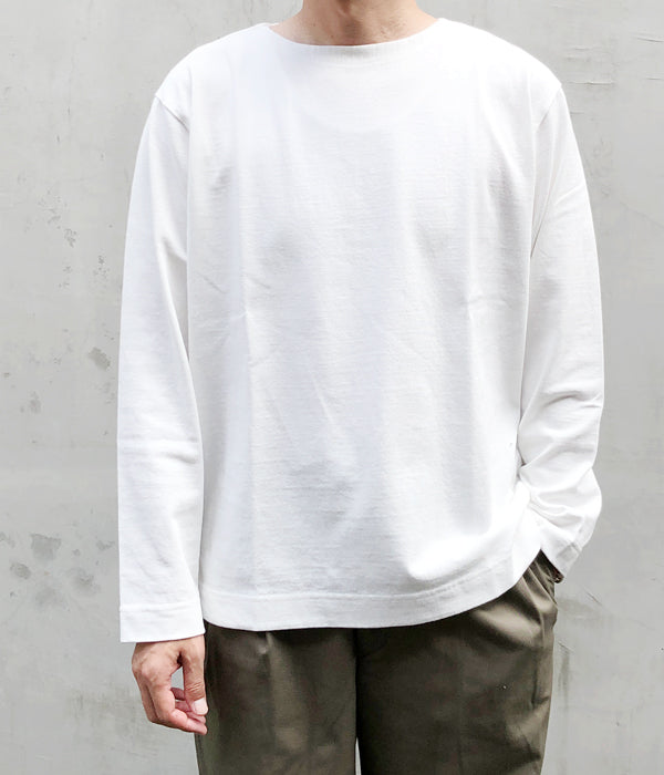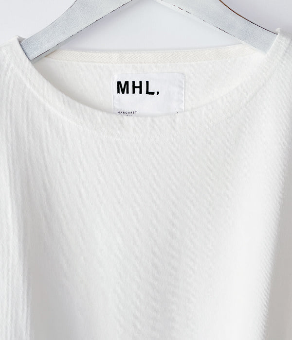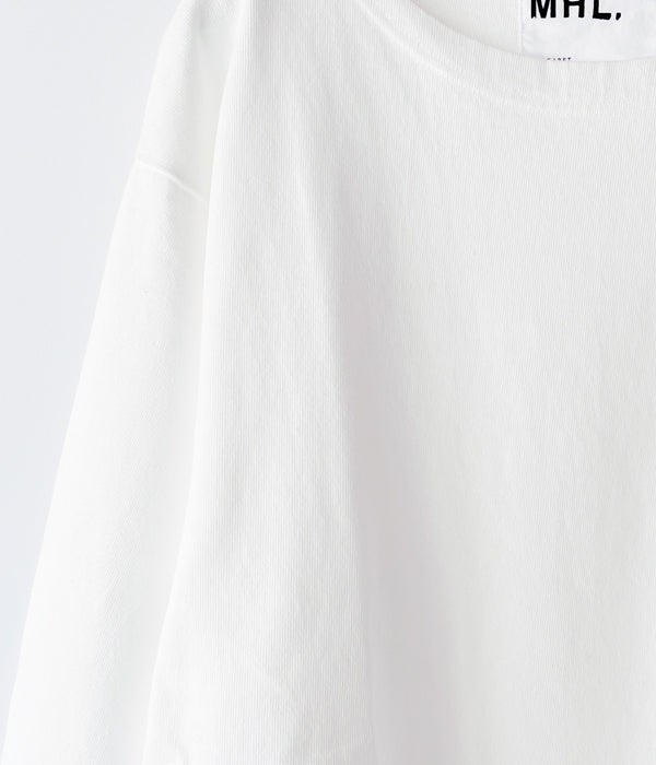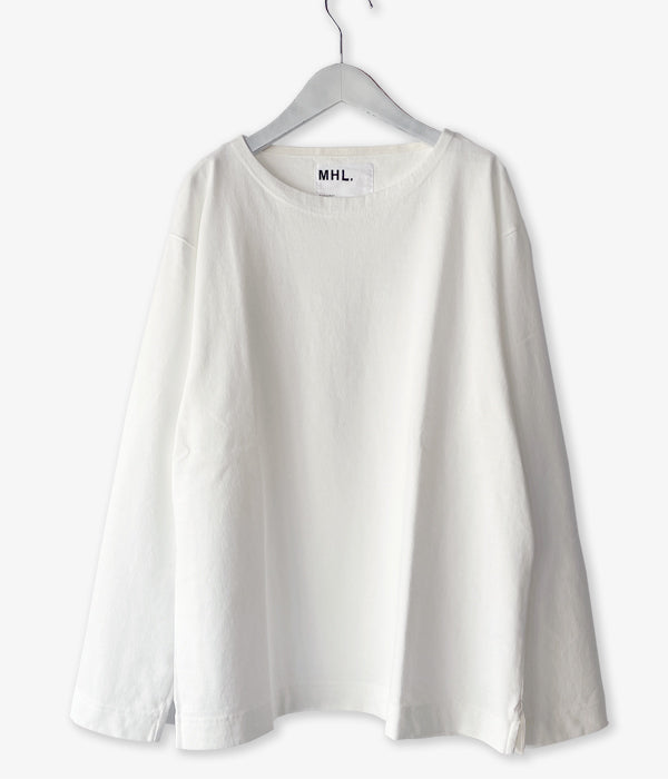 MHL.から、DRY COTTON JERSEY LSが入荷しました。ガシッとコシのあるコットン生地を使用したシンプルな長袖カットソー。リブは設けず折り返して処理したネック周りに、裾にはスリットを施した上品な仕立て。一枚でもインナーにも重宝するロングシーズン使える1着です。