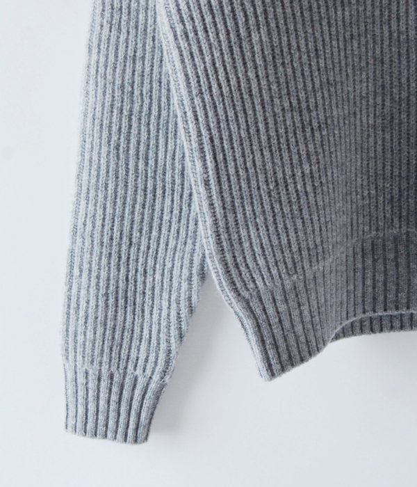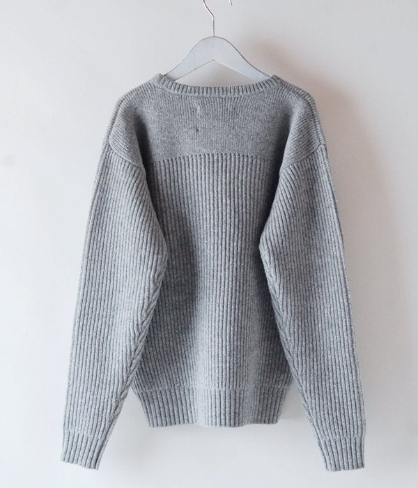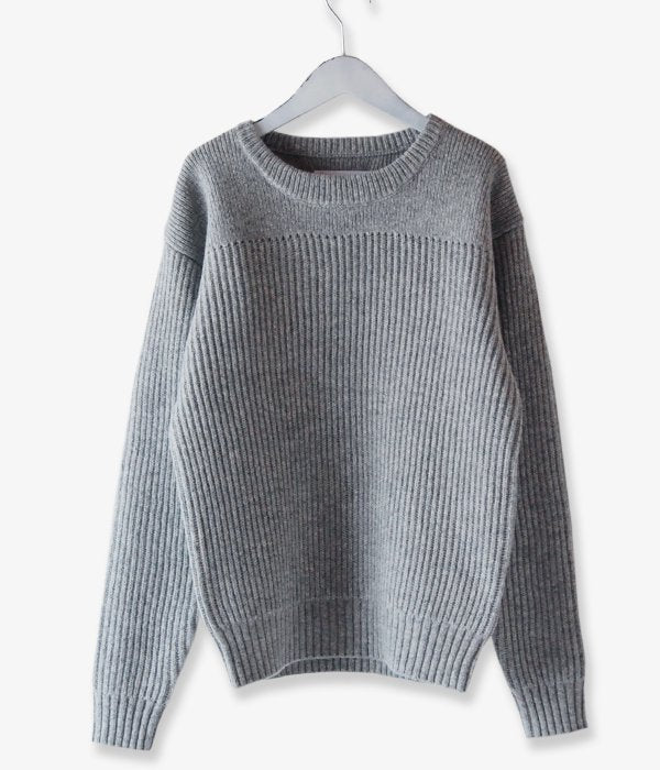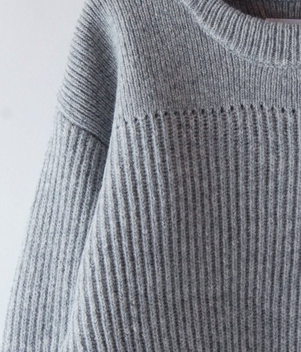 軽く膨らみのあるウール素材のニット。ゆとりのあるサイズ感、編地の変化など、シンプルながらこだわりのある一枚。