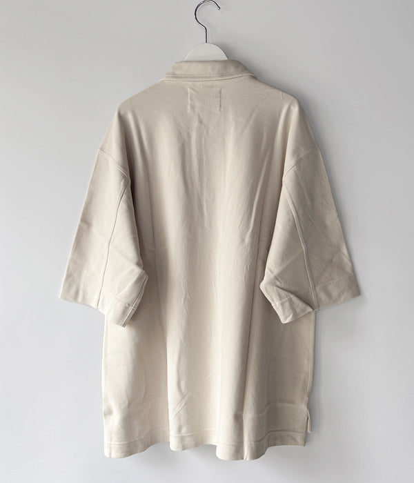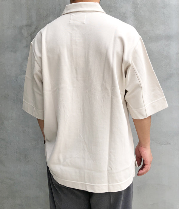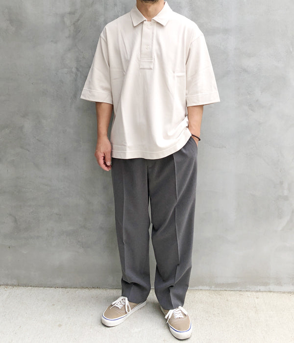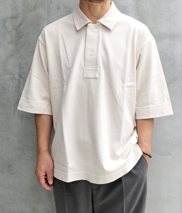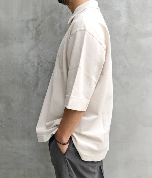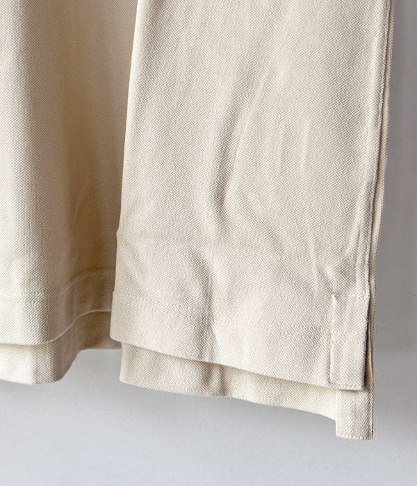 MHL.から、DRY PIQUE JERSEY POLO SSが入荷しました。程よく肉厚感のあるピケ素材を使用したポロシャツ。幅の広い前立ては上下で幅が異なり、オープンした際の見え方が面白いデザイン。長めの袖丈にゆったりとしたシルエット、前後異なる丈の裾にはスリットをあしらいました。