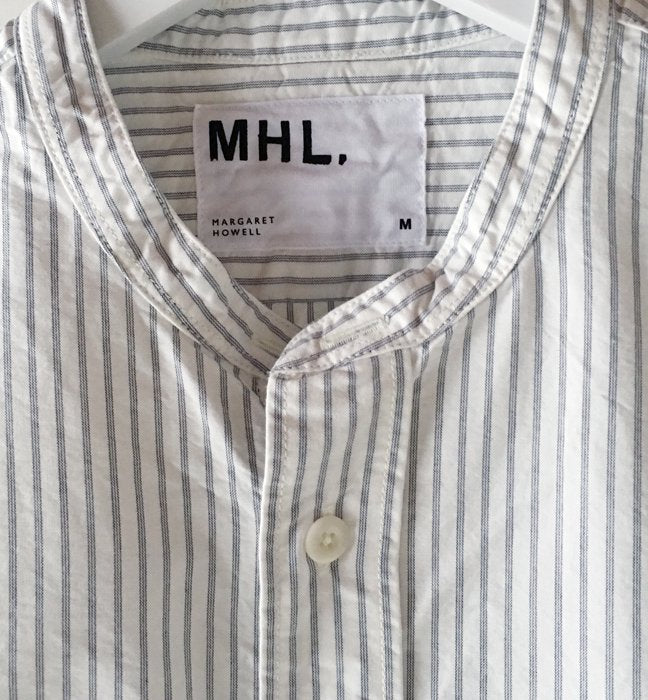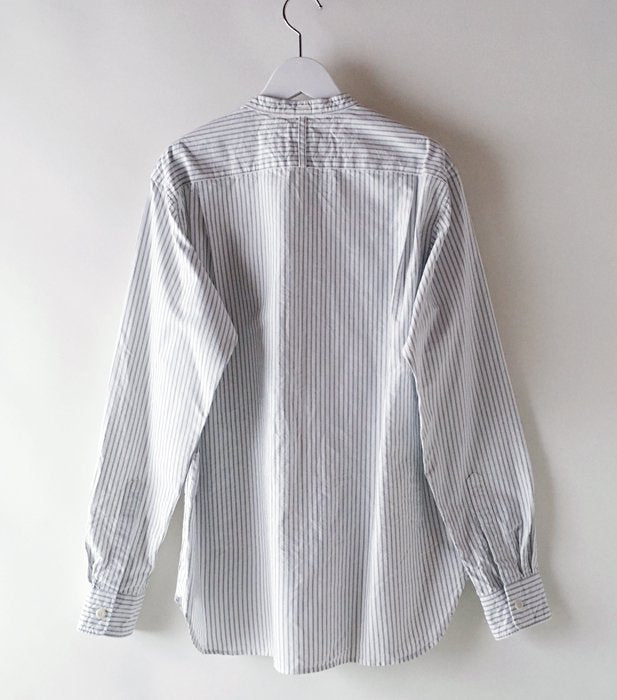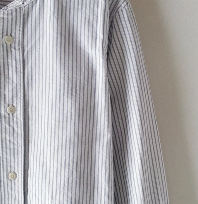 オフホワイト生地に黒細ストライプを走らせたスタンドカラーシャツ。がしっとしたタフな素材感でラフに羽織って様になる春っぽい一着です。