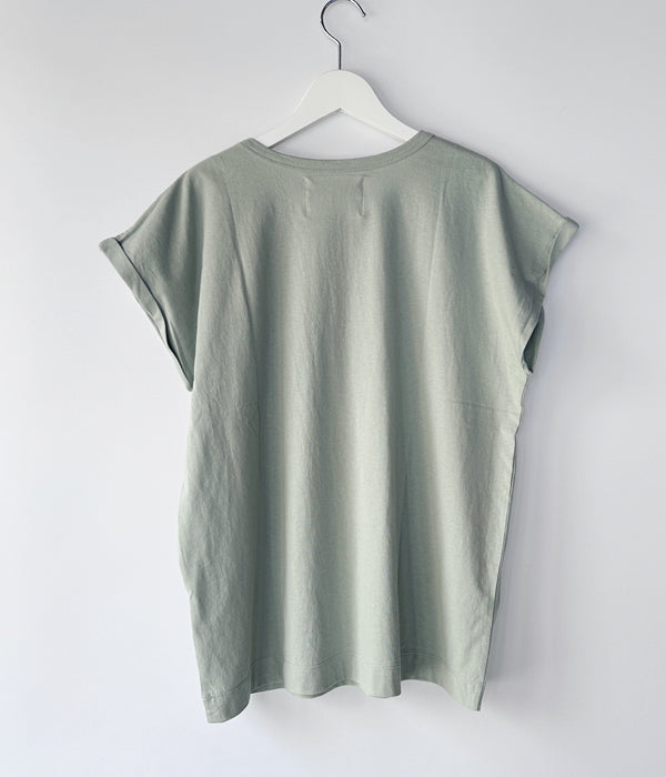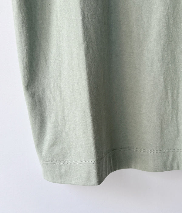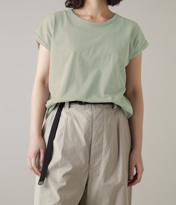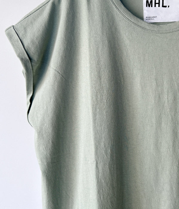 MHL.から、FINE COTTON JERSEY SS WOMENSが入荷しました。ドライタッチな薄手の天竺ジャージー素材を使用し、やや長めの着丈に、折り返しをロールアップ仕立てにアレンジしたフレンチスリーブ型の半袖Tシャツ。ゆったりとしたサイジングで一枚での着用から、インナーとしても使える定番の1着。