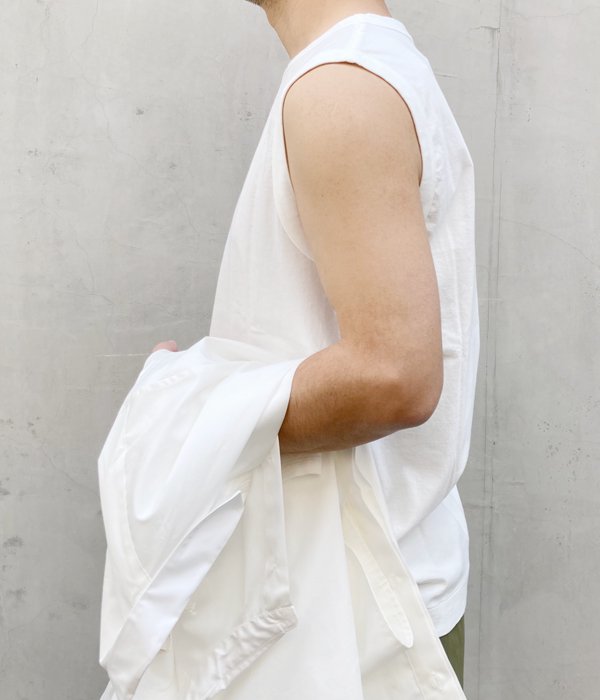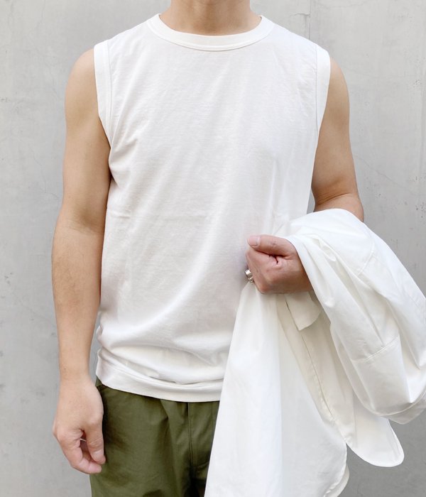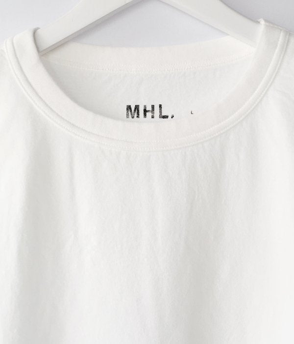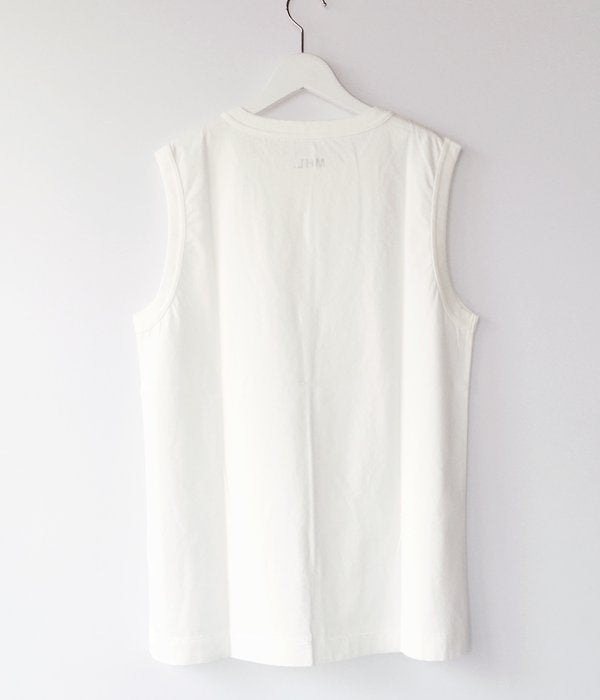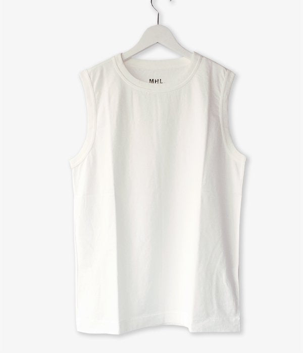 MHL.から、GARMENT DYE BASIC JERSEY TANKが入荷しました。伸縮性の良いコットンジャージー素材のクルーネック型タンクトップ。清潔感のあるシンプルなホワイトは汗ばむ時期のインナーアイテムとしてもマストな一着。プリントタグで快適な着心地。