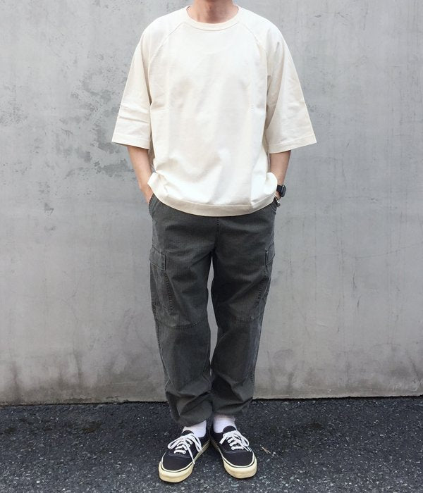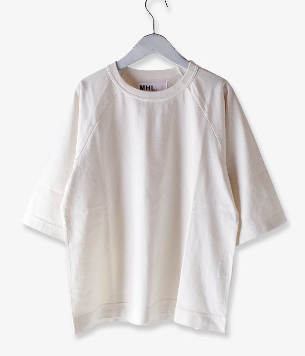 MHL.から、GARMENT DYE COTTON JERSEY T-SHIRTが入荷しました。製品染めによる味のある淡い色合いが春らしいカットソー。厚みと柔らかさを併せ持った素材感、リラックスフィットにラグランスリーブの仕立て。やや長めの設計の袖丈が印象的な一着。