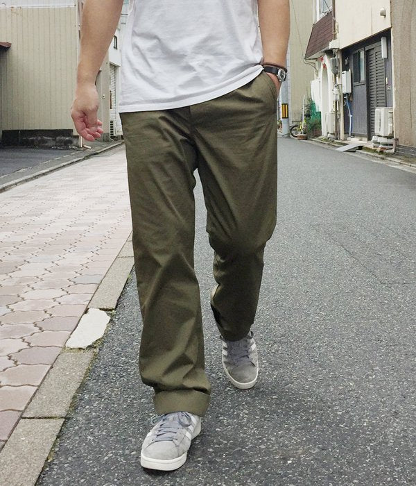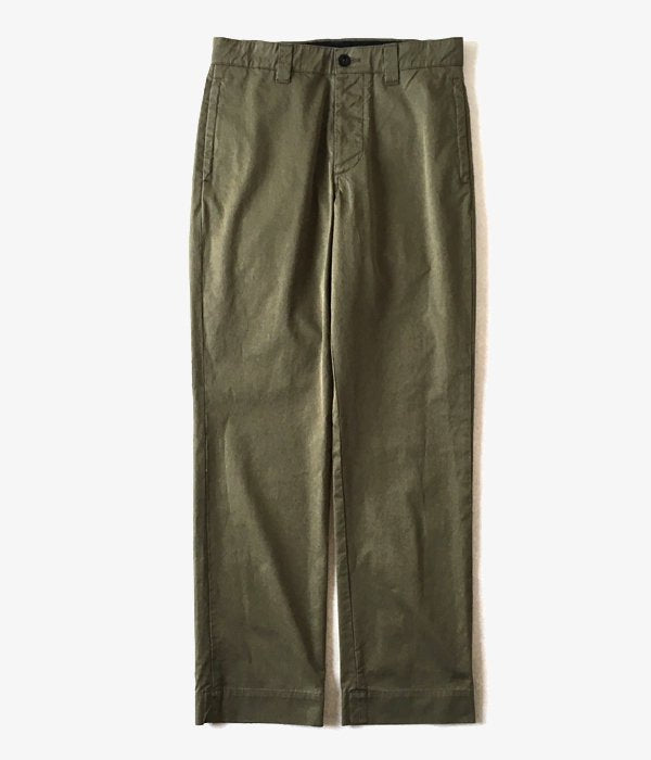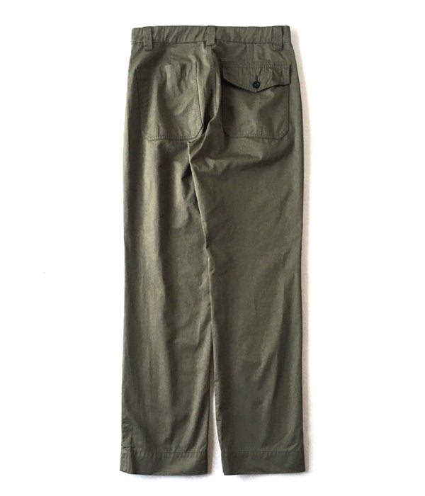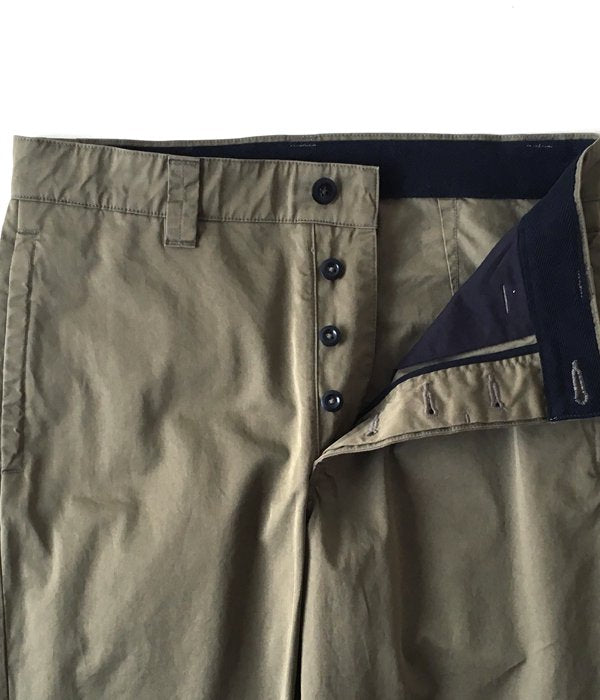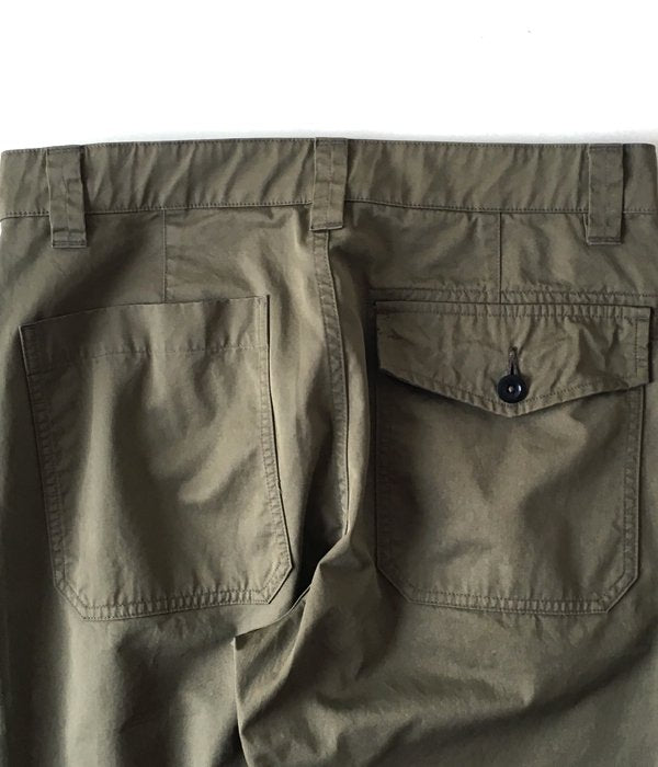 光沢のある綺麗なコットン素材に製品染めを施した、全体的にゆったりとしたシルエットのパンツ。左右異なるタイプのバックポケットがアクセント。フロントはボタンフライ仕様。