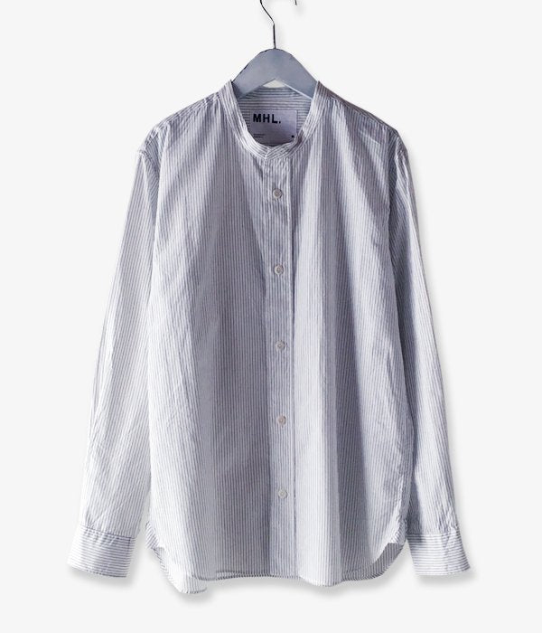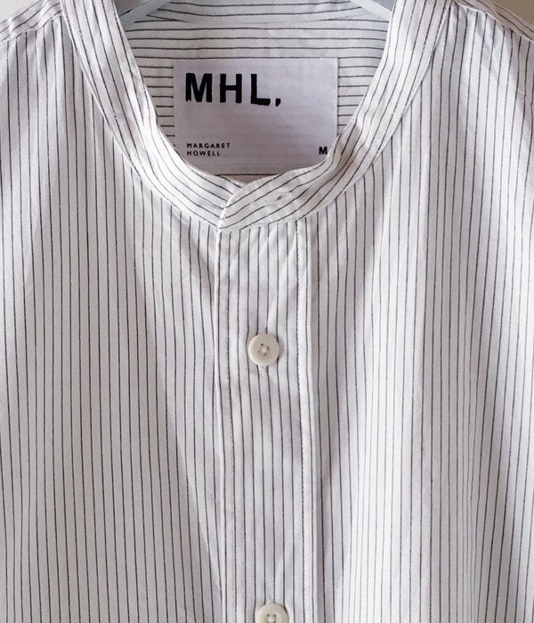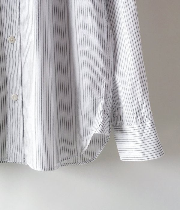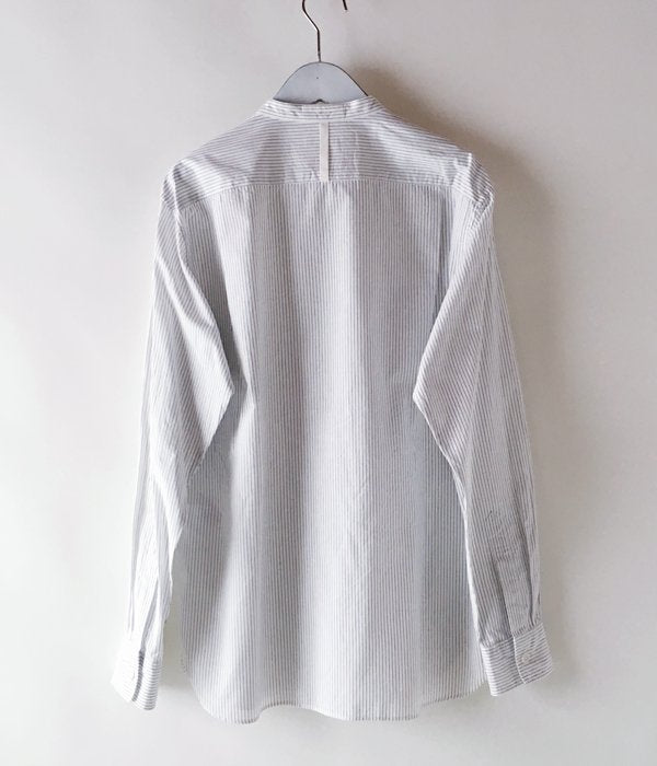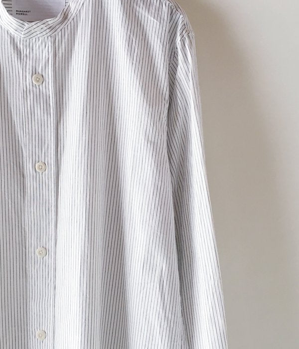 白地に黒のピンストライプが映えるシンプルなスタンドカラーシャツ。柔らかな素材感なのでニットとのレイヤードを楽しんだり、春になったらラフに羽織っても様になる仕立ての良い一着です。
