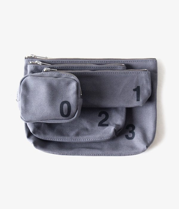各サイズごとに番号をプリントしたナンバリングポーチ。リップなどのコスメサイズから、ペンケース、ガジェットケースなど様々な使い勝手に対応するMHL.の人気アイテム。